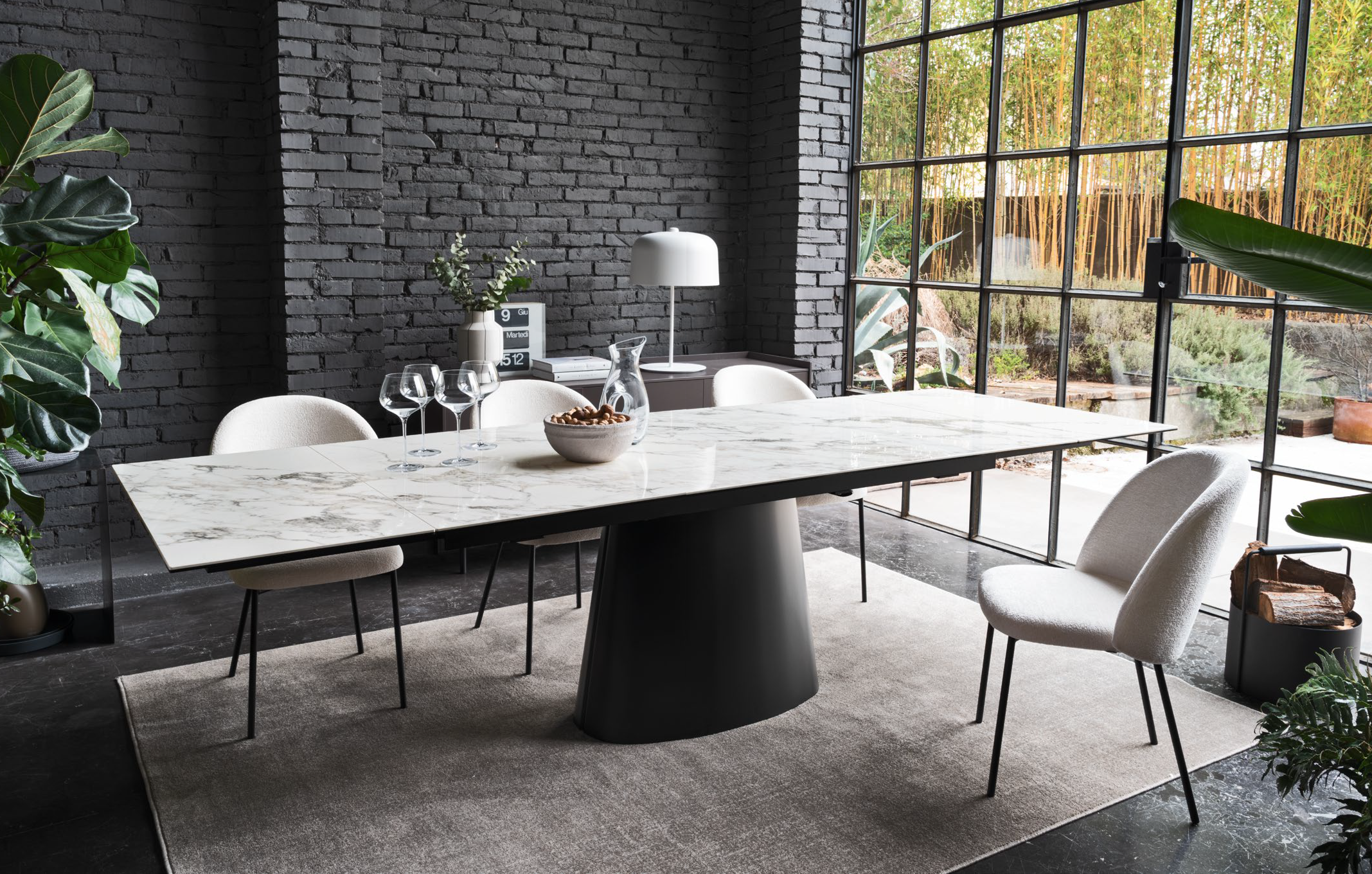 Der ausziehbare Tisch Ellisse von Connubia hat eine Keramikplatte auf Glas und Gestell und Gehäuse aus Metall. Ellisse ist in zwei Größen mit zwei seitlichen Verlängerungen erhältlich, die einzeln geöffnet werden können. Der Tisch verfügt über einen halbautomatischen Ausziehmechanismus; die Verlängerungen lassen sich durch Verschieben auf speziellen Führungen einfach positionieren.