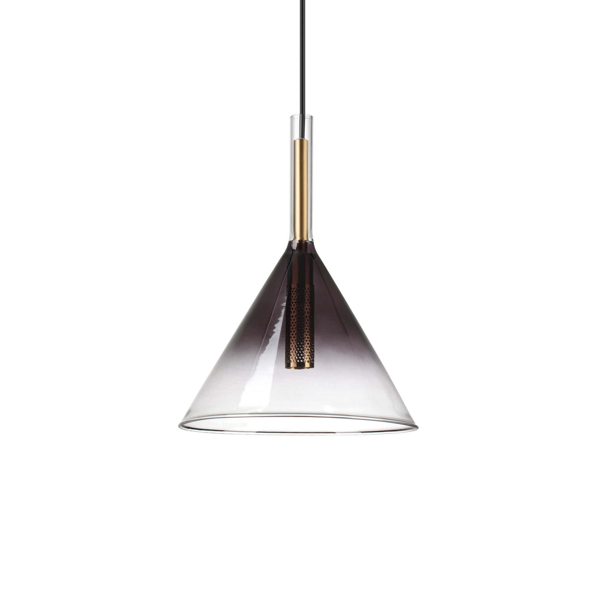 EMPIRE SP1 Kegel-Hängeleuchter von Ideal Lux mit vergoldetem Metallrahmen und Rosette mit Magnetverschluss ohne Schrauben. Schwarzes PVC-Kabel. Transparenter Glasdiffusor mit grauem Schirm. Glühbirne im Lieferumfang enthalten.
