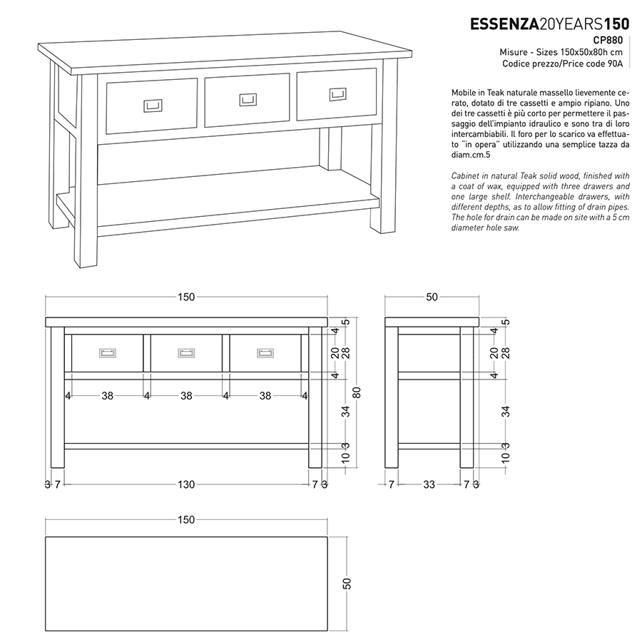Ein Stück, das aus der „Küche“ gestohlen wurde und zum Protagonisten im Badezimmer wird, mit seinen typischen wesentlichen Elementen wie Schubladen mit Holzführungen oder stabilen, quadratischen Beinen. Perfekt sowohl für ein als auch für zwei Spülbecken geeignet, garantiert es eine bequeme Installation der Spüle in jeder Position, egal ob rechts, links oder mittig.