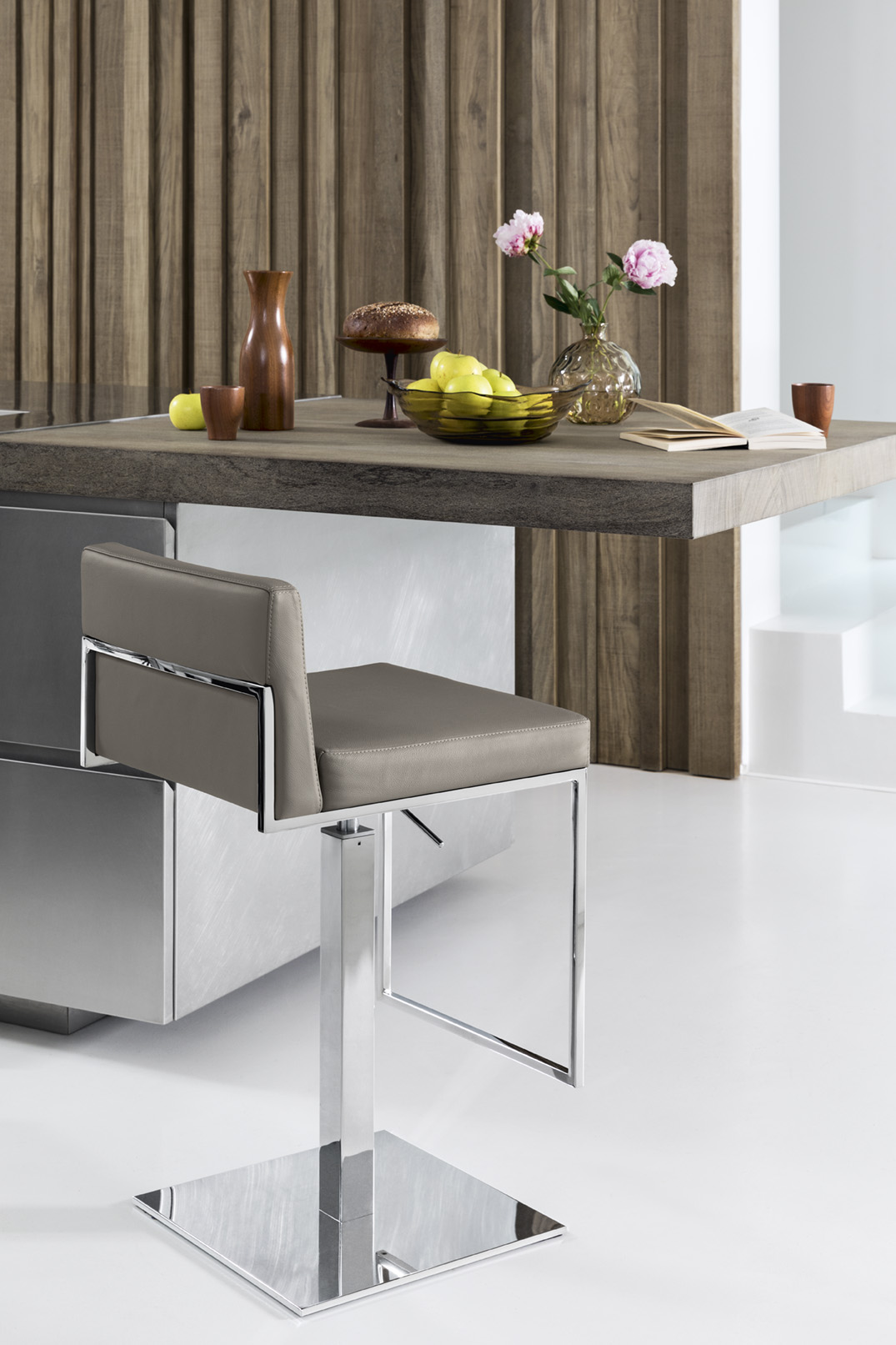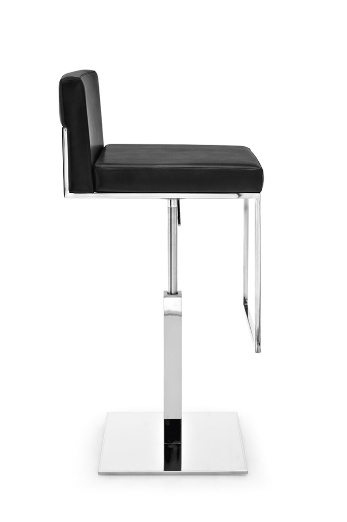 Der in die Rückenlehne eingelassene Metallrahmen und die gepolsterte, lederbezogene Sitzfläche verleihen diesem Produkt einen Hauch von Klasse. Der EVEN Hocker ist drehbar und mit einer Gasdruckfeder höhenverstellbar. Die Basis und die Mittelsäule haben einen quadratischen Querschnitt.