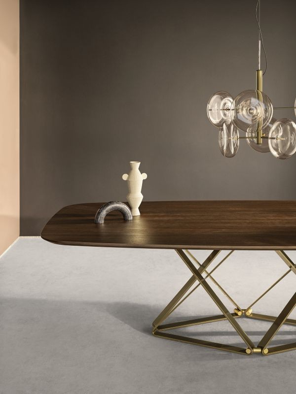 Die Struktur zeichnet sich durch geometrische Linien aus, die an das Thema des Tisches mit gekreuzten Beinen erinnern und es mit Leichtigkeit und wertvollen Details neu interpretieren, die seine starke Persönlichkeit unterstreichen. Aus lackiertem Stahl kann er in verschiedenen Ausführungen angeboten werden, die von Antikmessing über Gold bis hin zu Schwarz und Weiß, matt oder glänzend reichen.