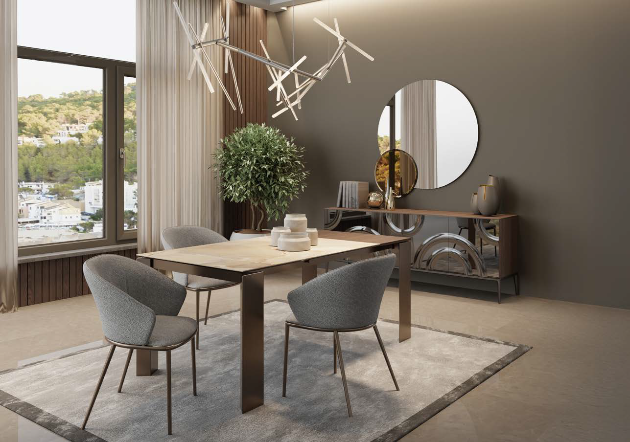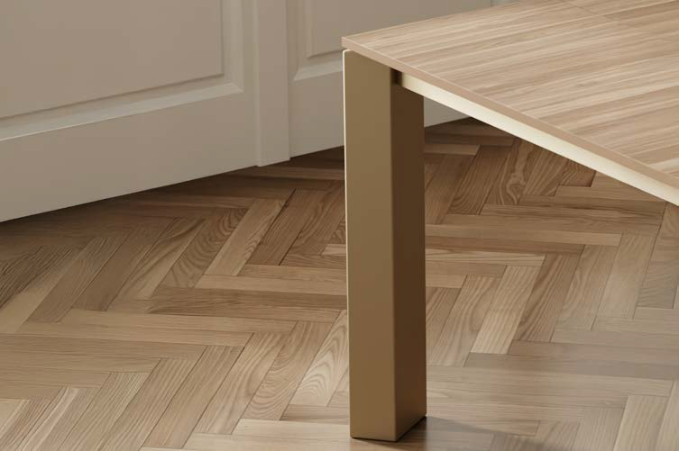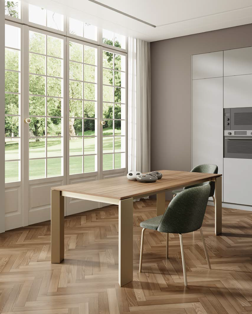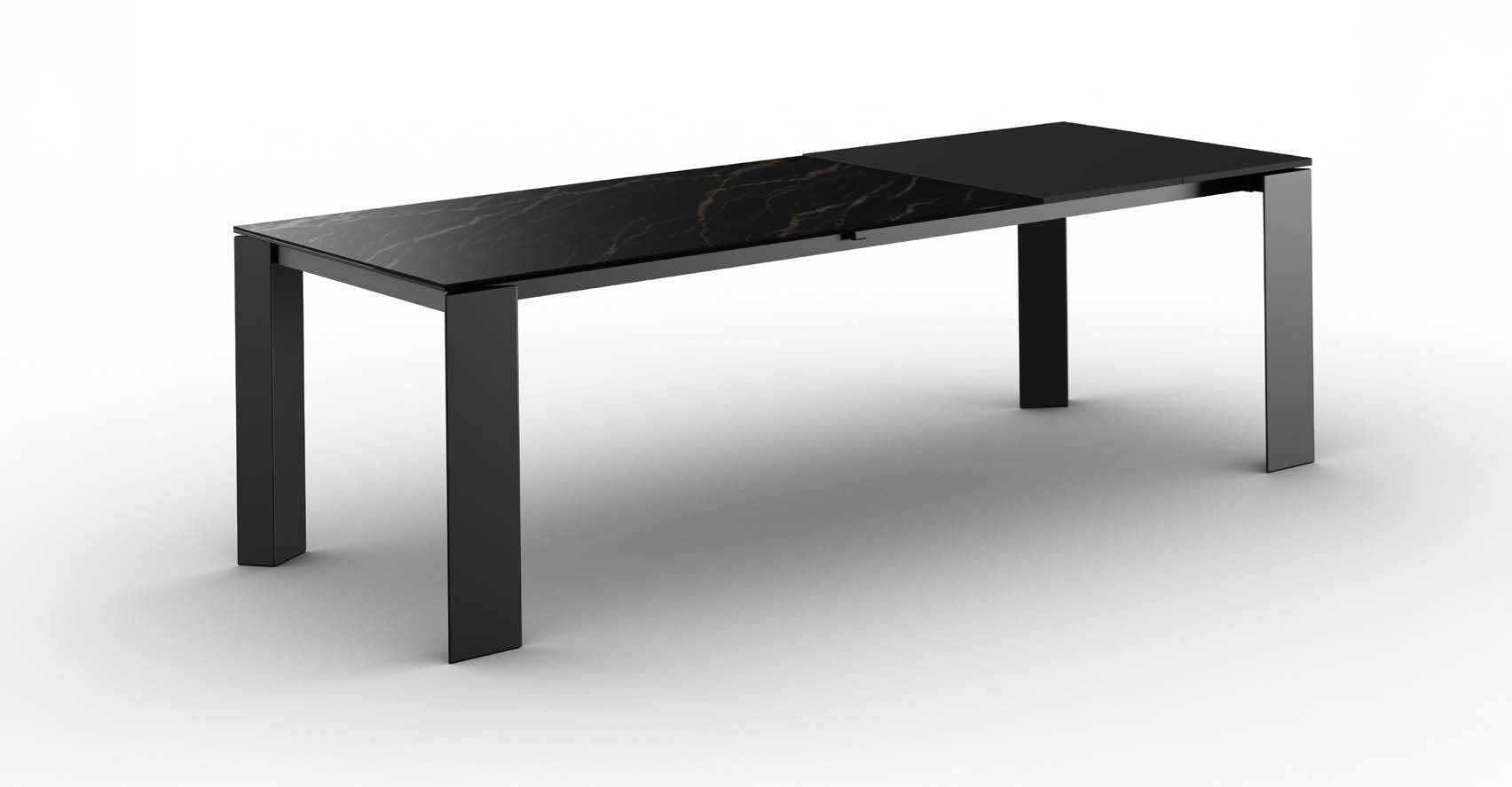 Fester oder ausziehbarer Tisch mit patentierter Teleskop-Ausziehführung aus Aluminium, Basis aus lackiertem Metall in verschiedenen Ausführungen und Tischplatte und Verlängerungen in verschiedenen Materialien und Ausführungen.