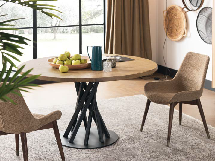 Fester runder Gemini-Tisch von Altacorte mit Platte aus Eiche oder Walnuss und Untergestell aus Stahl.