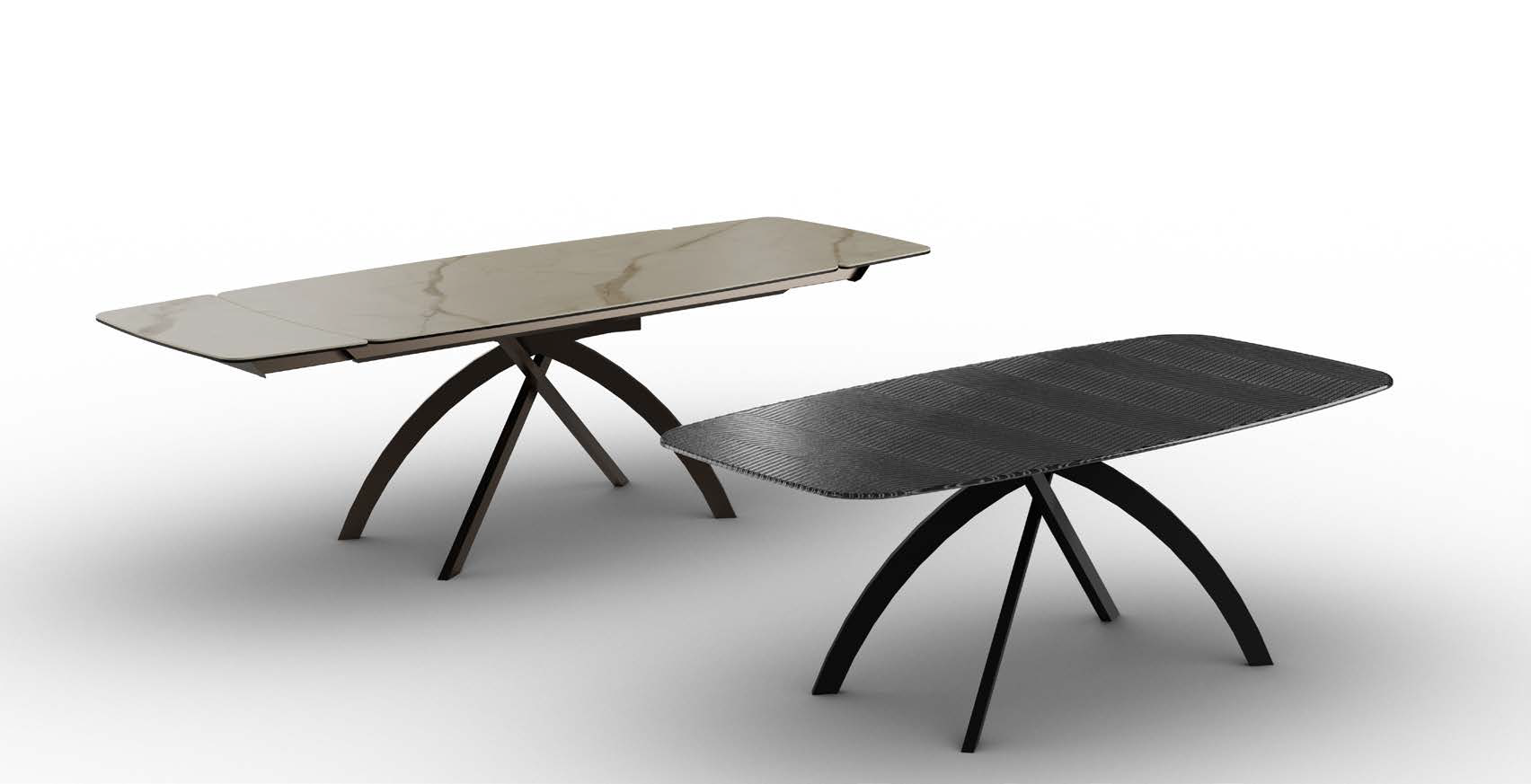 Fester Tisch mit lackiertem Metallgestell in verschiedenen Ausführungen sowie Platte und Verlängerungen in verschiedenen Materialien und Ausführungen.