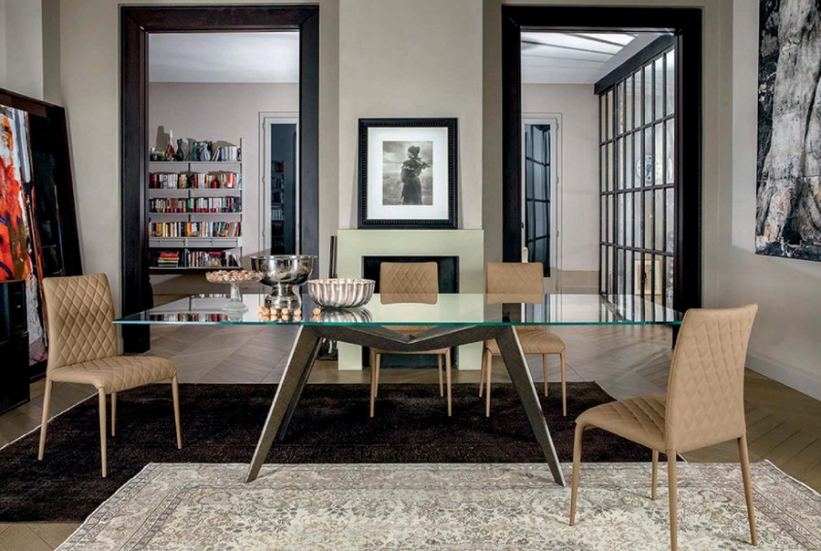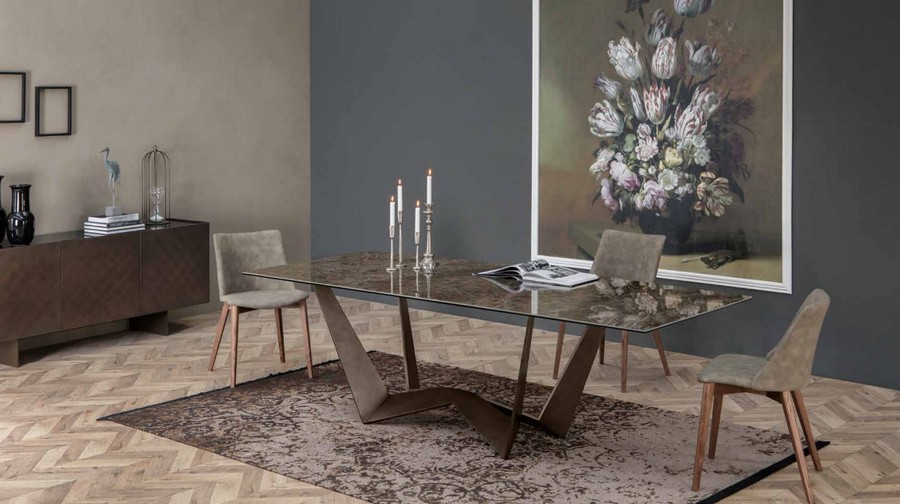 Der Reverse-Tisch von Tonin Casa ist ein fester Tisch mit einer Struktur aus lackiertem Stahl und einer Stein- oder Porzellanplatte aus Steinzeug. Reversible Tischbasis. Ein reversibler Tisch, der für jede Umgebung geeignet ist. Die asymmetrische Form der in verschiedenen Ausführungen lackierten Stahlbasis ist sehr elegant. Die Oberseite kann in Glas- oder Porzellansteinzeug geliefert werden.