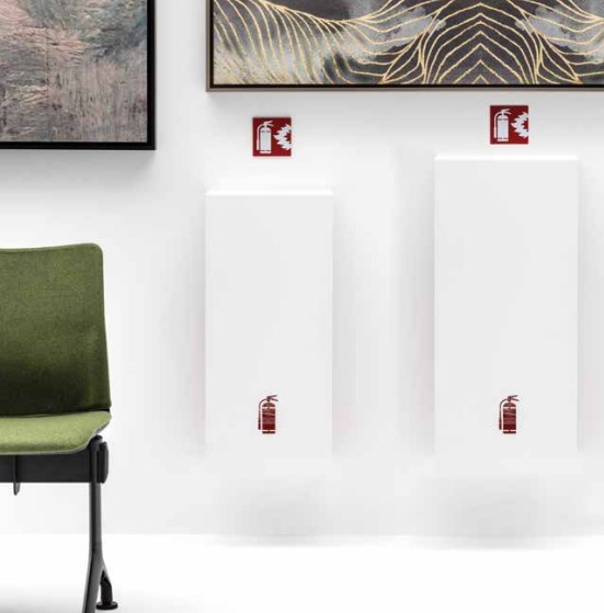 Feuerlöscherabdeckung aus 3 mm dickem Metall, epoxidlackiert, erhältlich in drei Farben mit aufgedruckten Erkennungssymbolen und roter Plexiglasplatte zum Aufhängen an der Wand. Ein wirklich minimalistisches Design ohne sichtbares Befestigungssystem. Erhältlich in zwei Größen.