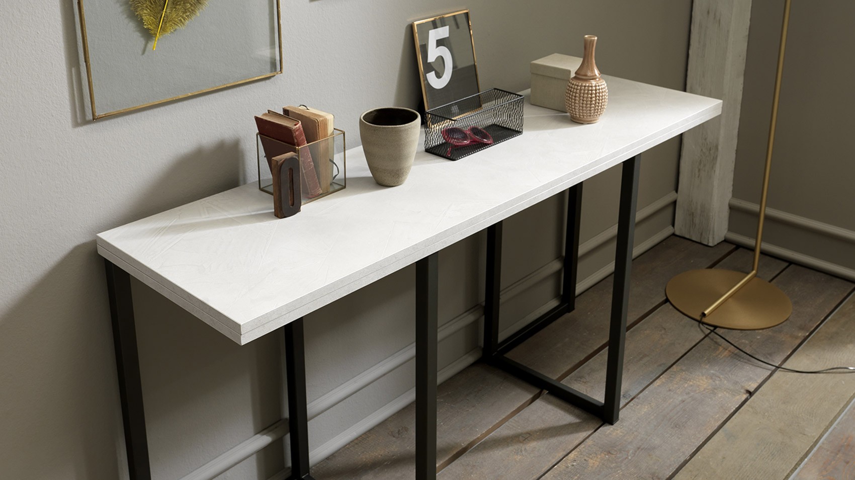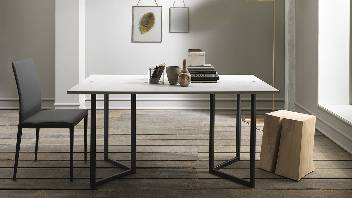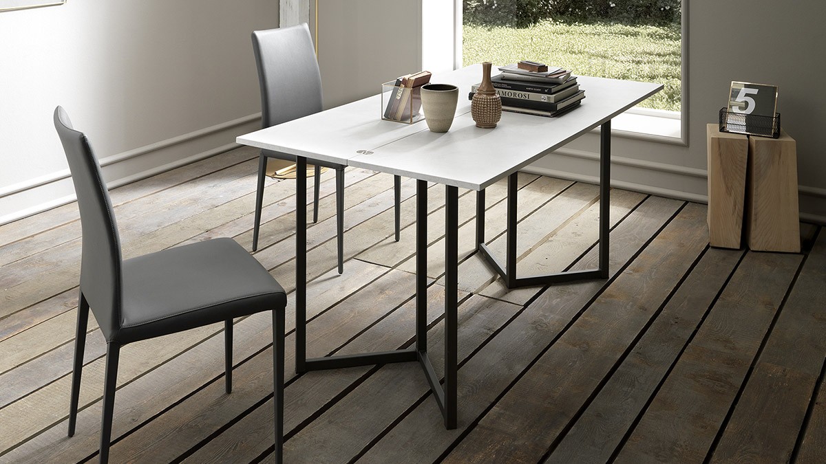Ausziehbare Konsole mit Metallstruktur. Doppelseitige Tischplatte im Buchstil in Melamin- oder Mörteloptik erhältlich. Klappe und Ausdruck von Modernität, präsentiert sich im trendigen „Schwarz-Weiß“-Look. Die Struktur öffnet sich wie ein Buch und erweckt einen originellen Schreibtisch zum Leben, der sich perfekt dem freien Geist derer anpasst, die Veränderung als Konstante betrachten.