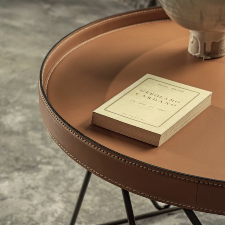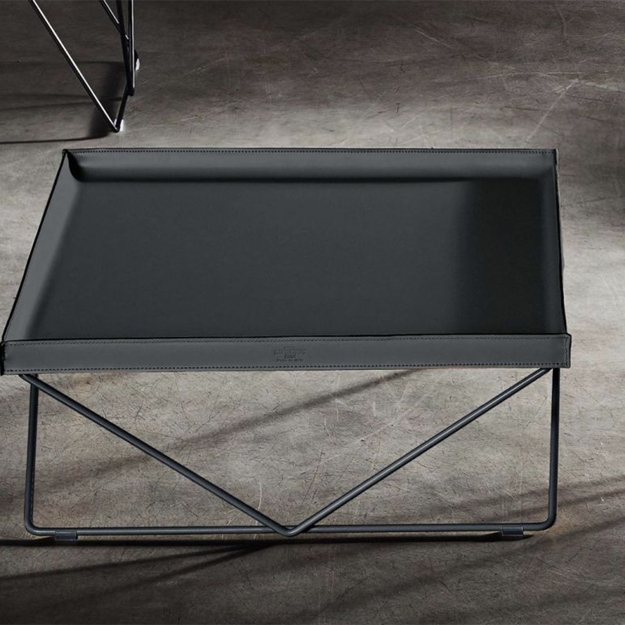 Couchtisch mit lackierter Stahlstruktur. Lederoberteil mit passenden oder kontrastierenden Nähten.