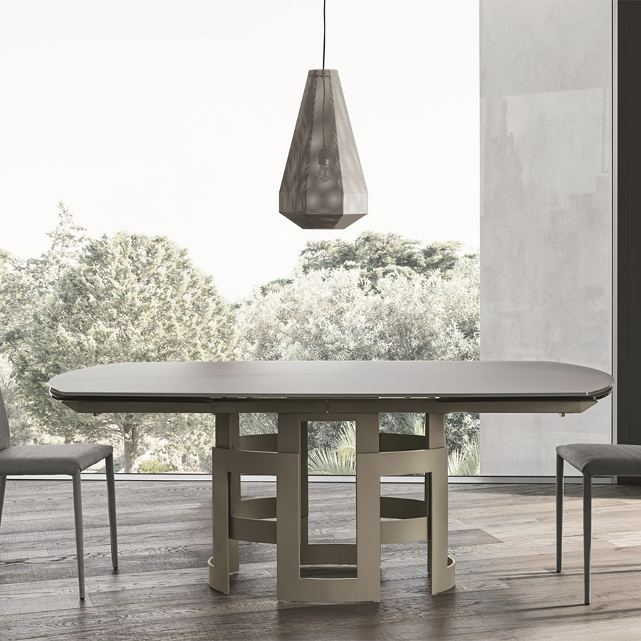 Der Imperial-Tisch von Bontempi besticht durch sein armbandförmiges Gestell und eine Tischplatte, die in zahlreichen Materialien und Ausführungen erhältlich ist. Der Imperial ist mit fester oder ausziehbarer Tischplatte in verschiedenen Formen und Größen verfügbar.