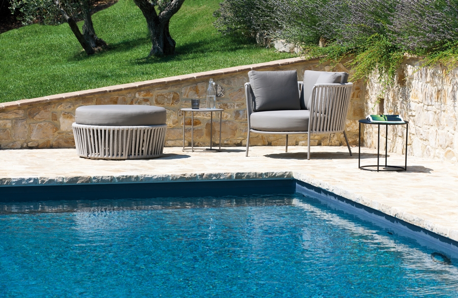 Eine Kollektion mit zeitgenössischem Geschmack, bei der die Verflechtung geometrischer Grundformen und essentieller Linien eine dynamische und funktionale Atmosphäre schafft. Das Wohnzimmer im Freien wird zu einem fließenden und manchmal traumhaften Raum, der sich perfekt in jede Umgebung einfügt.