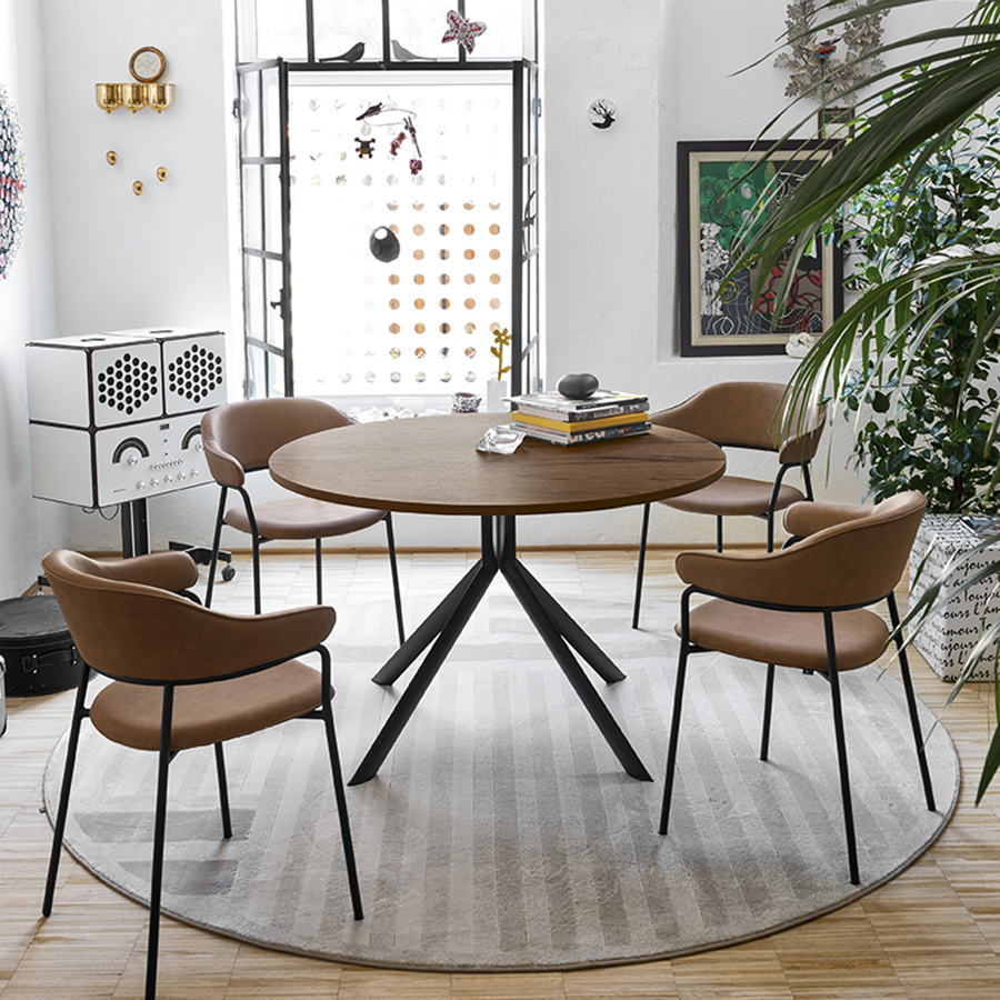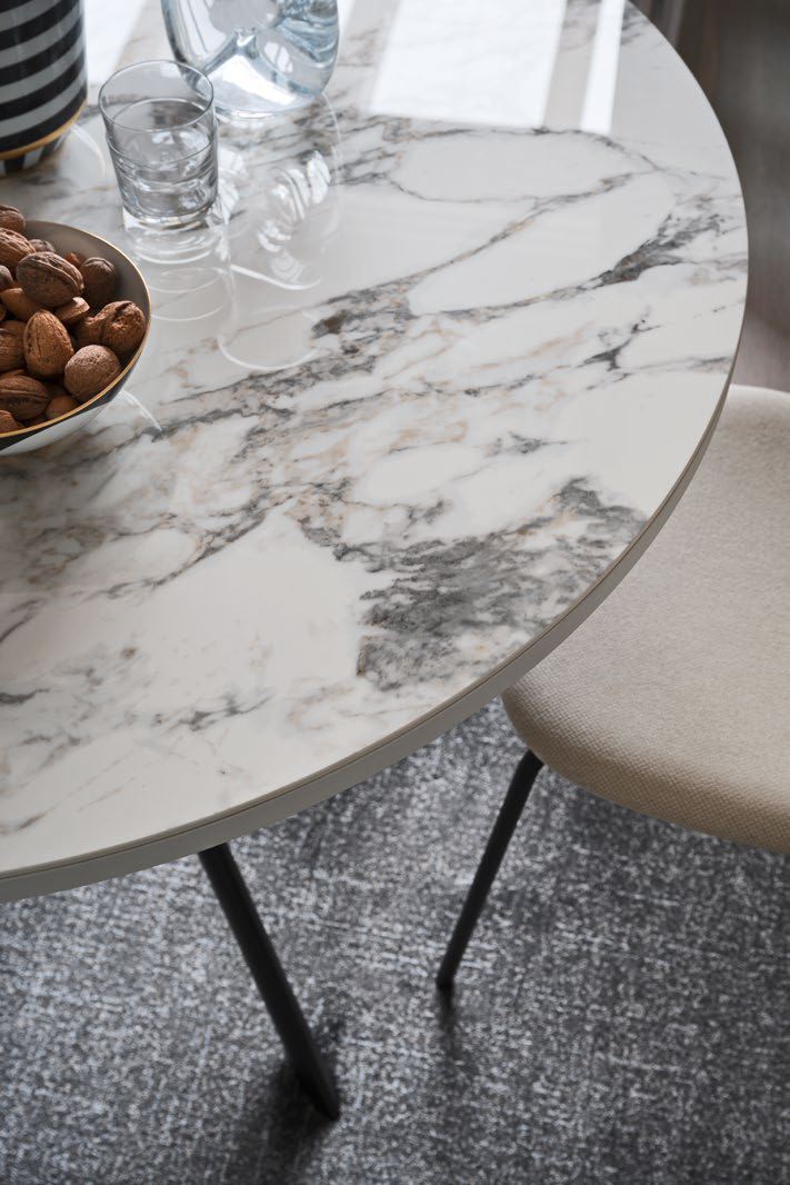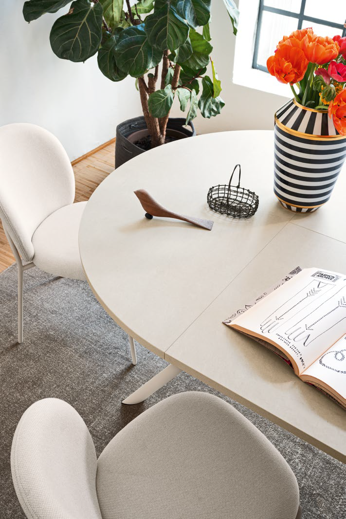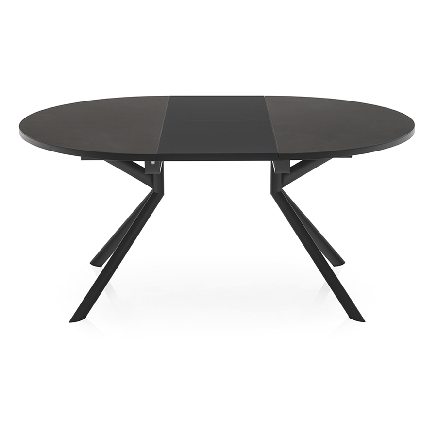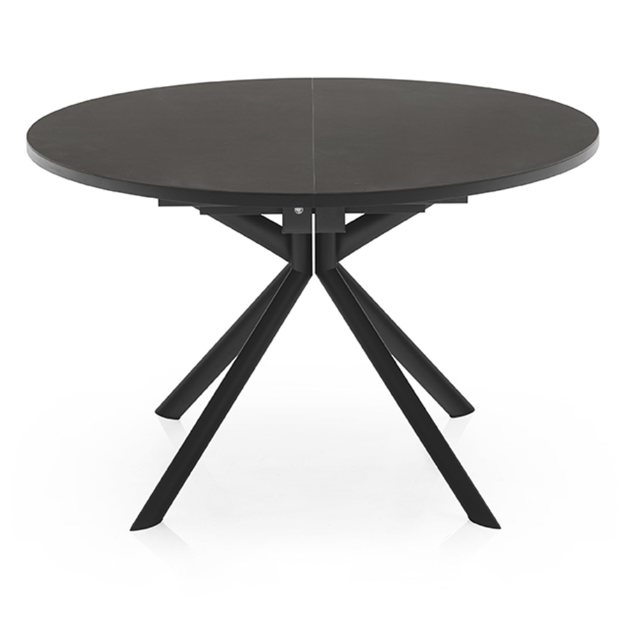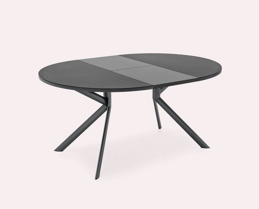 Ausziehbarer Tisch Giove von Connubia, Metallbasis mit runder Platte aus Holz, Holz-Keramik oder Holz-Glas.