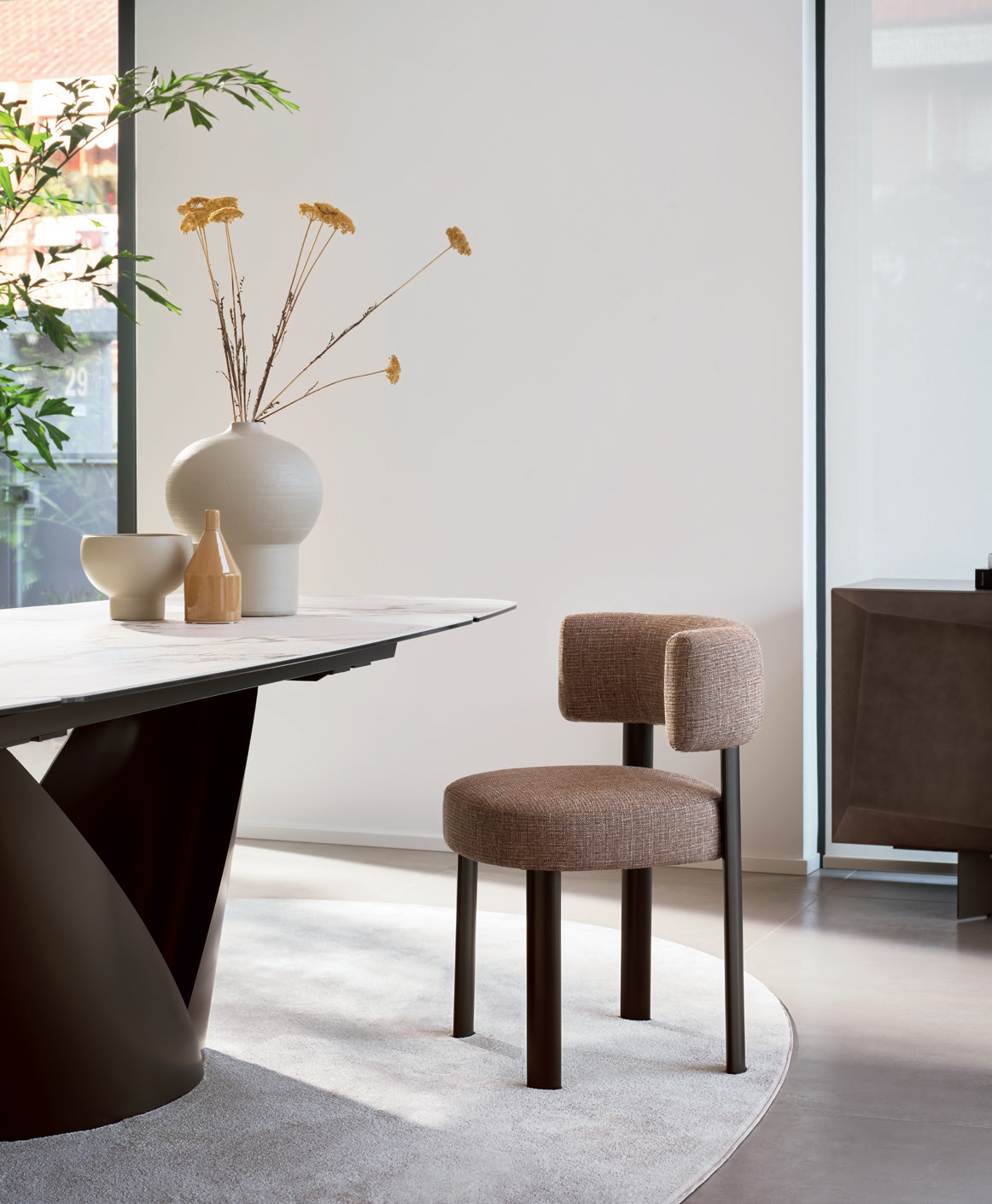 Der Stuhl Glen zeichnet sich durch sein schlichtes Design aus. Linien und Volumen verleihen ihm eine starke Persönlichkeit und schaffen ein optisches Gleichgewicht zwischen Solidität und Leichtigkeit. Sitzfläche und geschwungene Rückenlehne, ein prägendes Designelement, sind aus einer rein geometrischen Form entstanden. Seine umhüllende Form verleiht dem Stuhl eine harmonische Ästhetik und bietet ergonomischen Halt, der sich der natürlichen Körperhaltung anpasst.