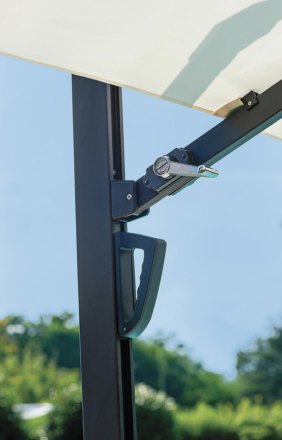 Das anthrazitfarbene Aluminiumgestell mit seinem modernen, geradlinigen Design harmoniert perfekt mit dem ecrufarbenen Sonnendach und erzeugt so einen eleganten und vielseitigen Gesamteindruck. Die 45 x 79 mm starke Seitenstange sorgt für gute Stabilität bei gleichzeitig geringem Gewicht und praktischer Bauweise.