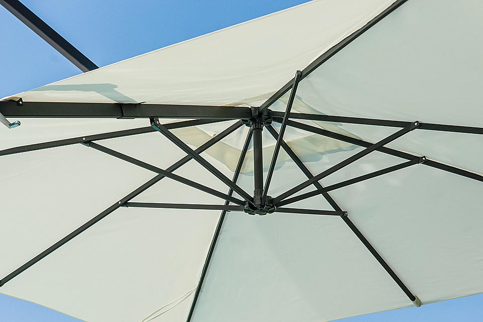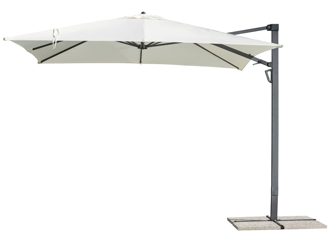 Der Alabama-Sonnenschirm (3 x 3 Meter) mit seitlicher Stange ist die perfekte Lösung für alle, die großzügigen Schatten ohne störende Elemente in der Mitte wünschen. Dank seiner versetzten Konstruktion bietet er mehr Platz unter dem Schirmdach und eignet sich daher ideal für Esstische, Gartenliegen und Entspannungsbereiche.