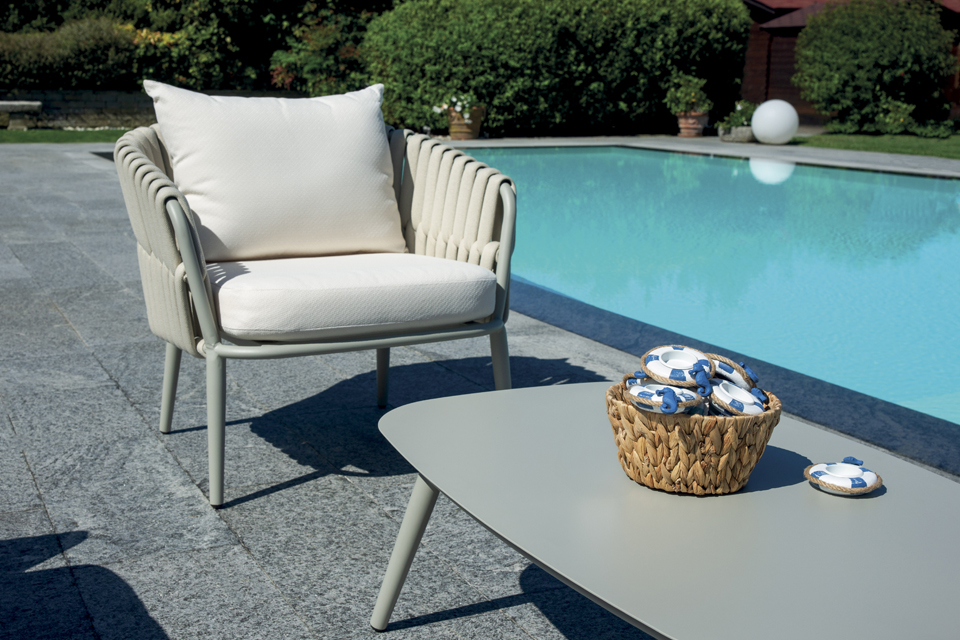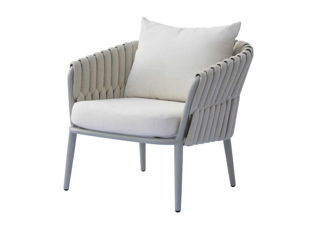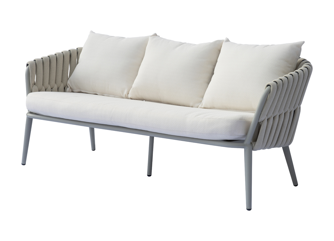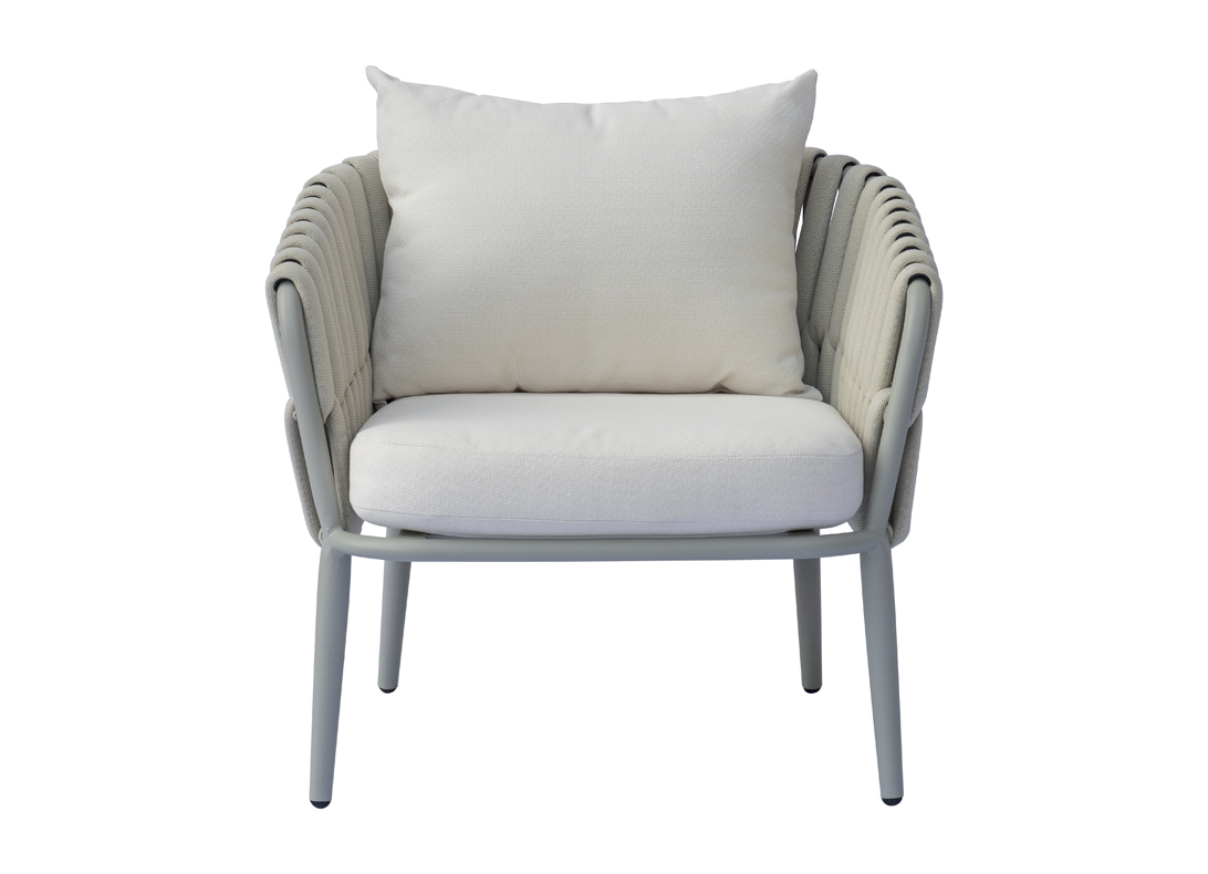 Das tonfarbene Aluminiumgestell, kombiniert mit beigefarbenem Polsterseil, vereint Leichtigkeit, Langlebigkeit und modernes Design. Die abnehmbaren cremefarbenen Kissen sorgen für Praktikabilität und einfache Reinigung, während die Aluminiumtischplatte ideal zum Abstellen von Getränken, Snacks oder Dekorationen geeignet ist.