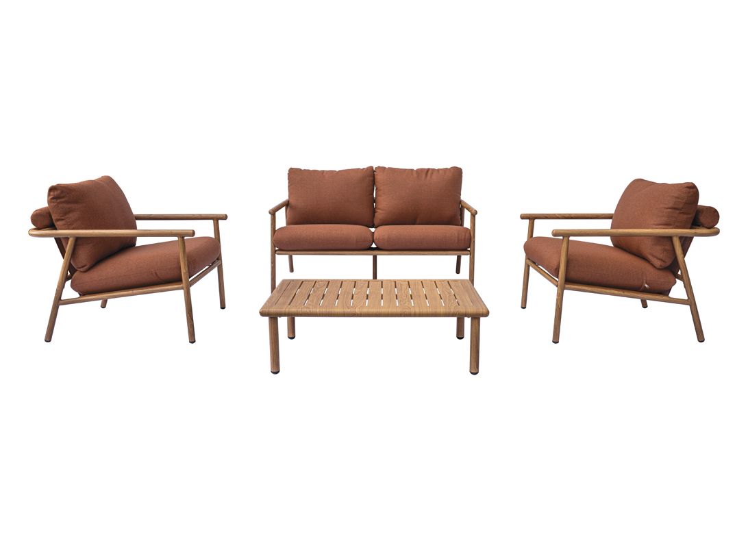 Das Gestell aus Aluminium in Holzoptik vereint Leichtigkeit und Stabilität und garantiert so eine lange Lebensdauer, auch im Außenbereich. Die abnehmbaren roten Kissen setzen farbliche Akzente und sind leicht zu reinigen, während die Tischplatte aus Aluminium ideal für Getränke und Snacks geeignet ist.