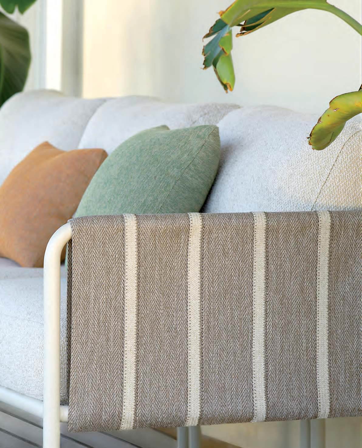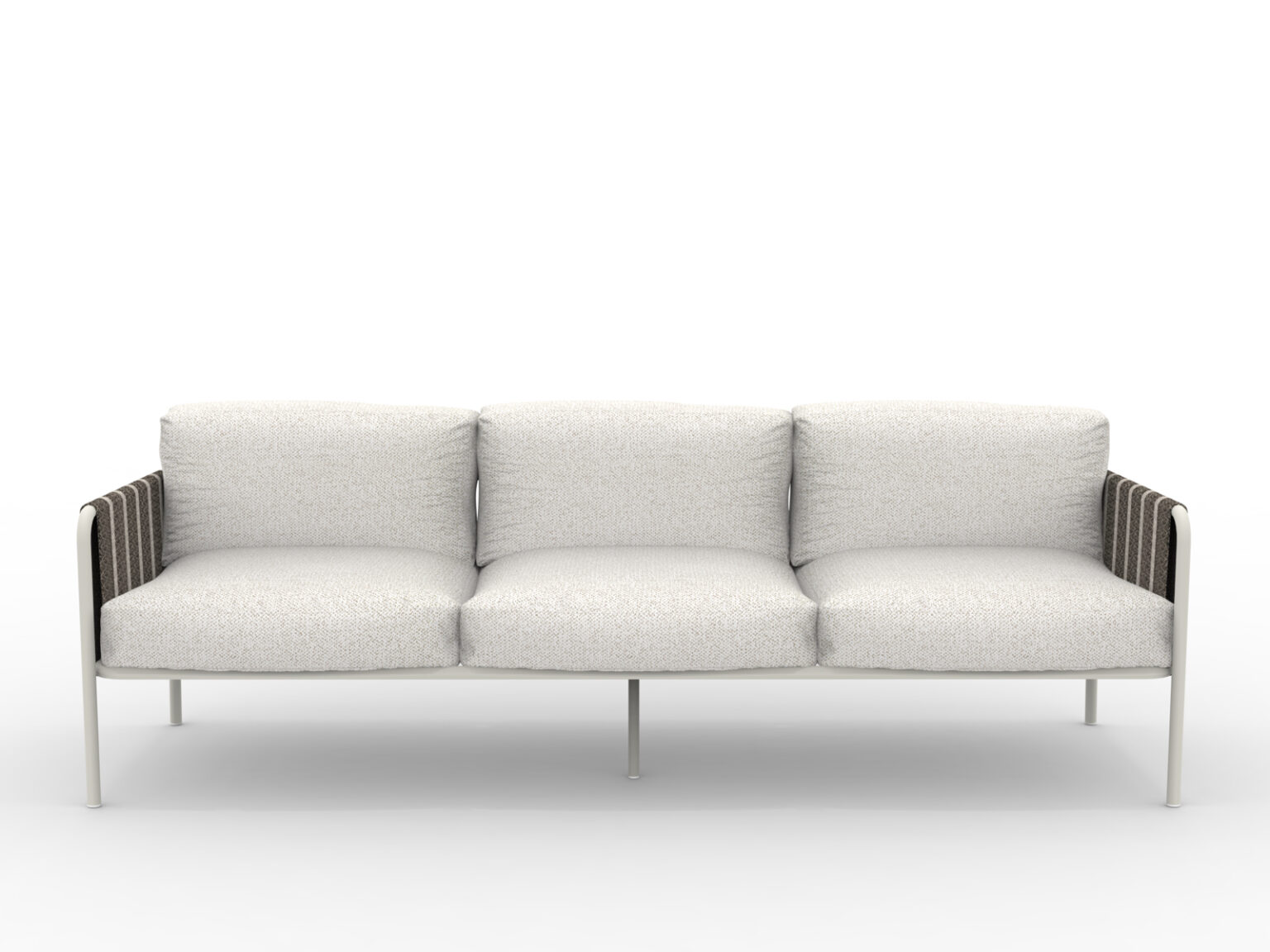 Das elegante und schlichte Dreisitzer-Sofa Hamptons ist in zahlreichen Ausführungen erhältlich: Tatsächlich ist es möglich, sowohl die Farbe der Kissen als auch der Metallstruktur auszuwählen.