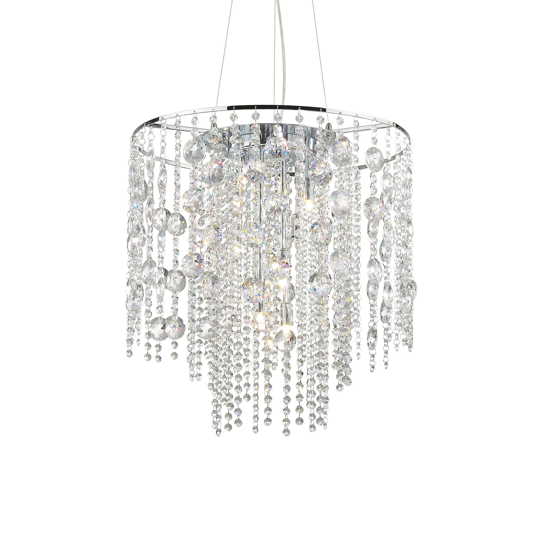 Hängeleuchter EVASIONE SP10 von Ideal Lux mit Anhängern aus geschliffenem Kristall. Aufhängungen mit Stahlseil mit einstellbarer Länge über automatische Seilstoppvorrichtung. Glühbirnen im Lieferumfang enthalten.