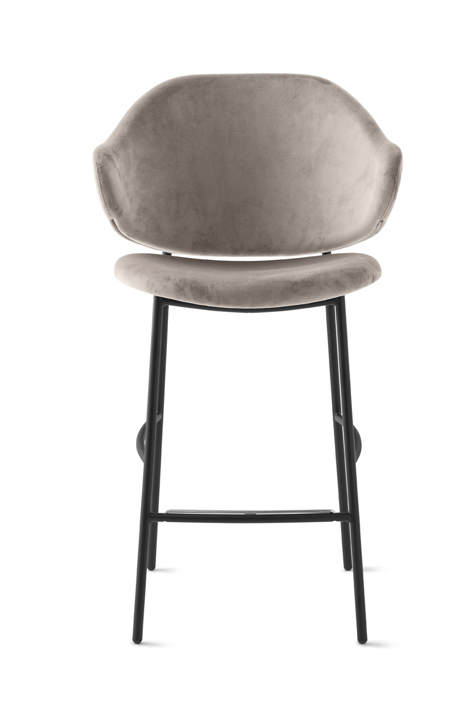 Dieser Hocker besticht durch seine umhüllende, gepolsterte und großzügig bemessene Rückenlehne, auf der Sie Ihre Arme bequem ablegen können.