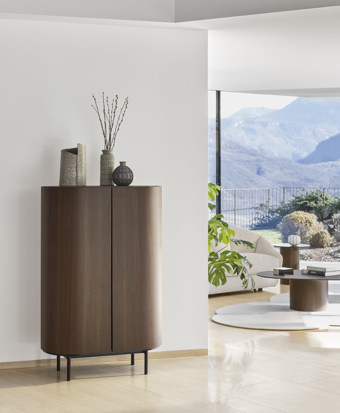 Das Sideboard LAKE CS6076 von Calligaris mit seinen weichen, harmonischen Linien steht vom Boden ab und weist eine ovale Form auf, die durch eine leicht vom Umfang zurückgesetzte Keramikplatte betont wird, wodurch zwischen Tür und Platte ein nützlicher Raum zum Öffnen von Türen und Schubladen entsteht.