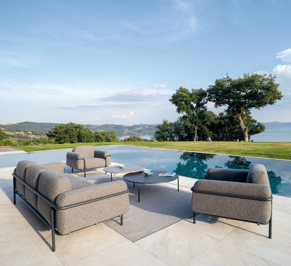Der niedrige Hug-Sessel von Vermobil zeichnet sich durch eine minimale geometrische Struktur und große Sitzflächen aus, die, wie der Name schon sagt, einer Umarmung ähneln.