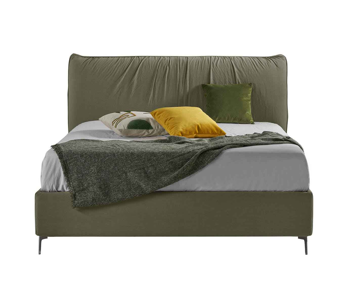 Es kombiniert gekonnt moderne und geradlinige Volumen mit der Eleganz einer raffinierten Drapierung am Kopfteil und macht dieses Bett zu einem Produkt feinster Handwerkskunst.