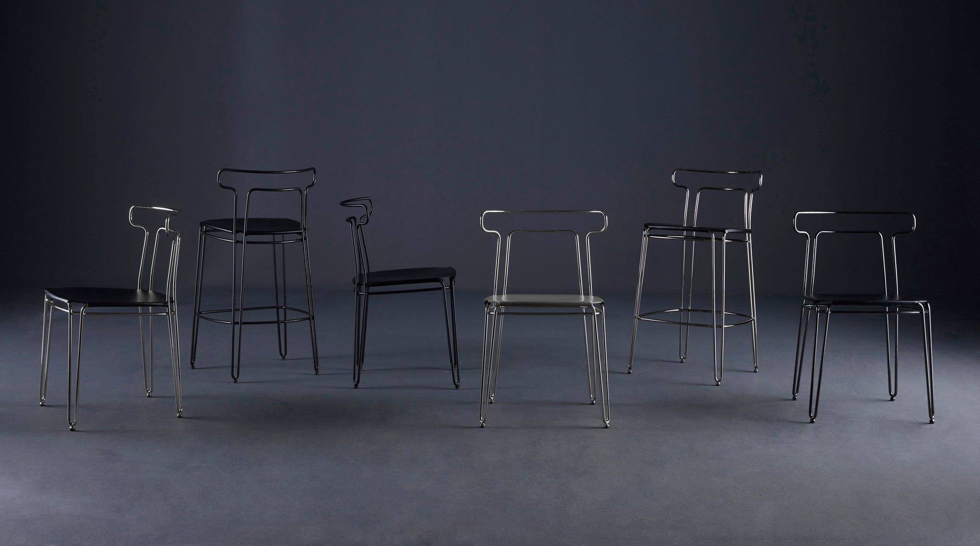 Stuhl mit Stahlstangenrahmen und Sitzfläche mit Lederbezug. Warm und überzeugend, die harmonische Linienführung erinnert an Sitzmöbel aus vergangenen Zeiten, das verwendete Material ist kühl. Eine einzigartige Balance, die Jackie zu einem einzigartigen und unnachahmlichen Stuhl macht.