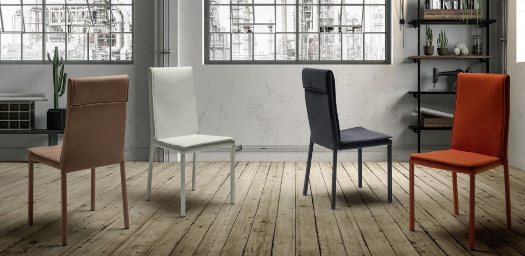 Kilt-Stuhl von Zamagna mit Metallrahmen und 3D-Sperrholzsitz, bezogen mit verschiedenen Materialien und Ausführungen. Kilt ist ein moderner und eleganter Stuhl, der geeignet ist, Ihr Wohnzimmer und Ihren Wohnraum aufzuwerten.