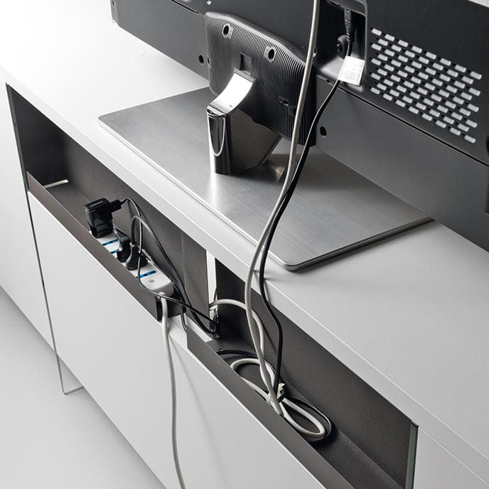 TV-Ständer mit einem 25 mm starken, umweltfreundlichen Laminatrahmen und 18 mm starken Schiebetüren. Innen stützen zwei 10 mm starke Scheiben aus gehärtetem Glas den Rahmen und sorgen für eine dezente Transparenz. Höhenverstellbare Füße und abnehmbare Kabelabdeckungen aus lackiertem Stahl.