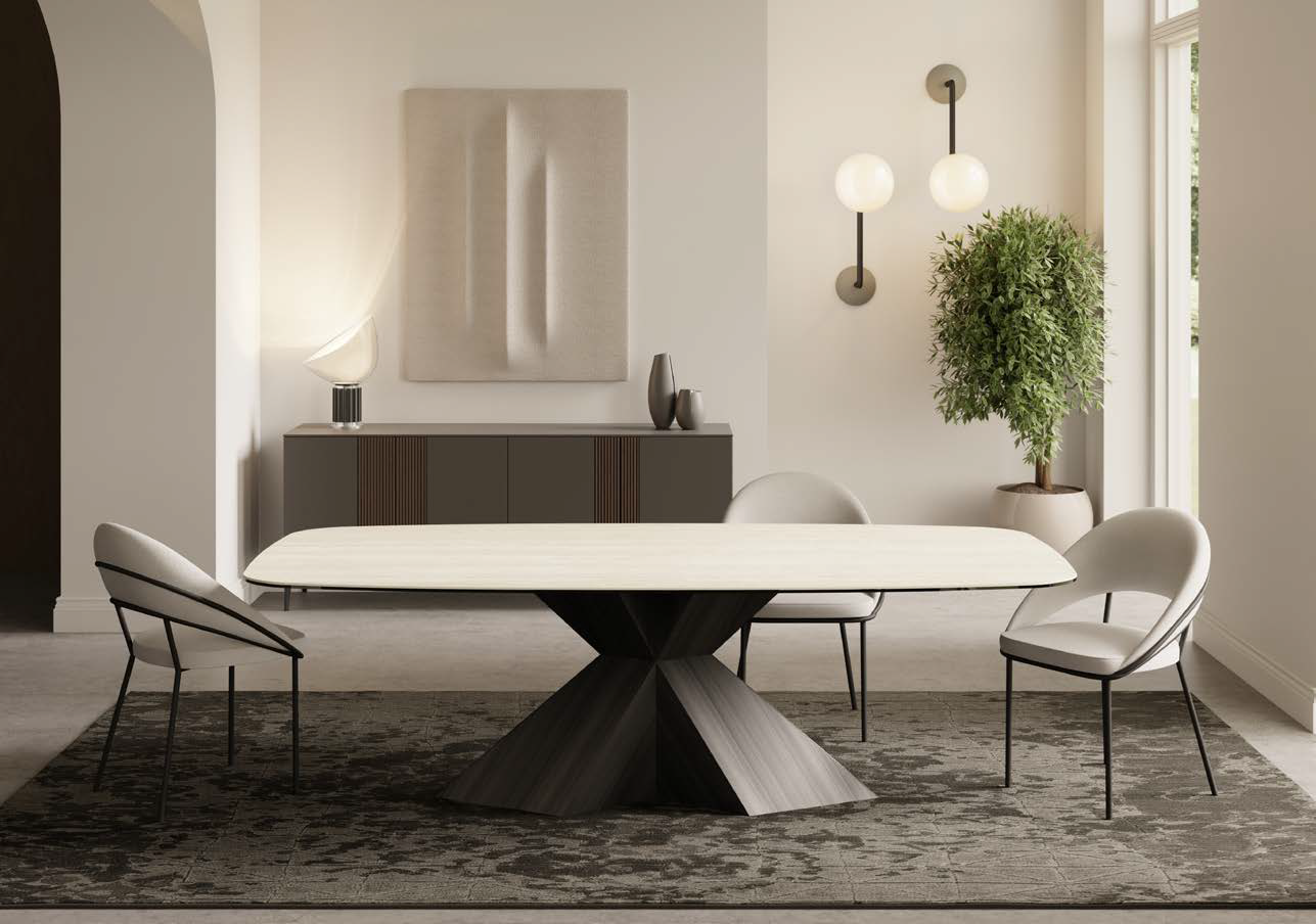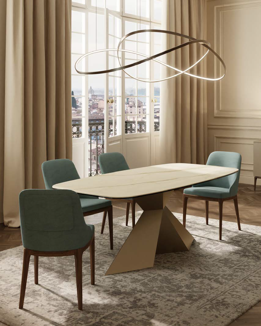 Fester oder ausziehbarer Tisch mit lackiertem Metallgestell in verschiedenen Ausführungen und Platte und Verlängerungen in verschiedenen Materialien und Ausführungen.