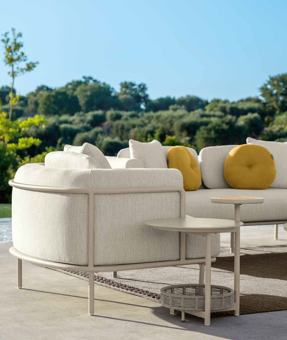 Das Sofa der Lisa-Kollektion vereint Komfort und modernes Design mit einem leichten und dennoch robusten Metallrahmen. Die gepolsterte Sitzfläche ist mit hochwertigem Bezug und dekorativen Kissen ausgestattet, die farbliche Akzente setzen und das Sofa perfekt für anspruchsvolle Außenbereiche machen.