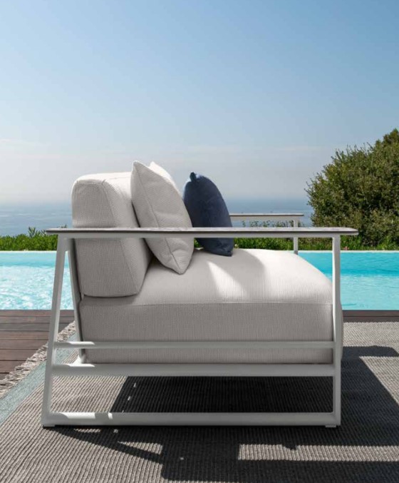 Der Living Riviera Sessel mit seiner tiefen, großzügigen Sitzfläche lädt zum Entspannen ein. Das elegante und leichte Aluminiumgestell bietet Platz für großzügige Kissen, deren edle Textur durch die ausgewählten Garne zusätzlich betont wird. Die Armlehnen aus Steinzeug runden das Design ab und verleihen ihm eine noch raffiniertere Note. Damit ist dieser Sessel die perfekte Ergänzung für Ihren Außenbereich.