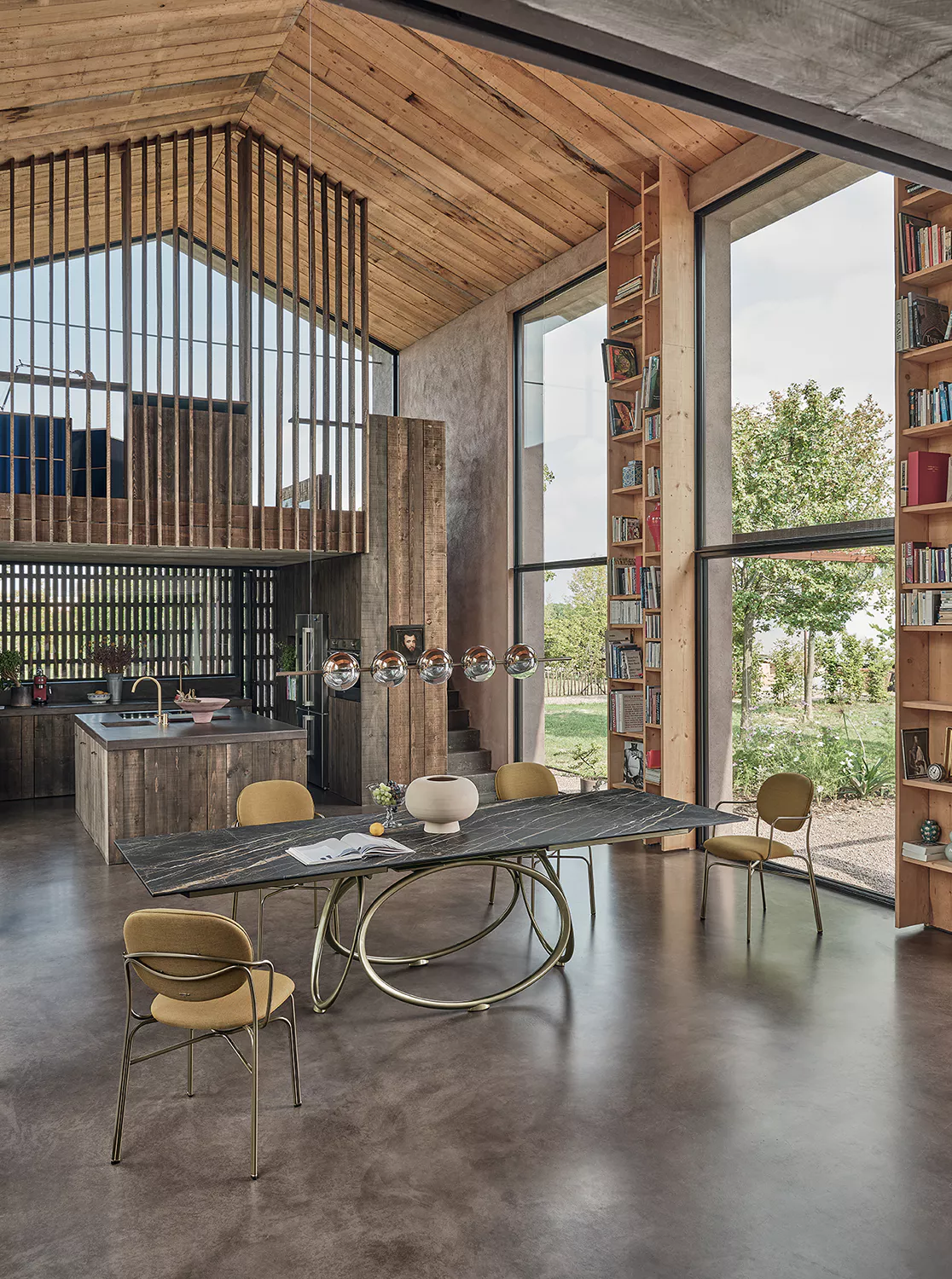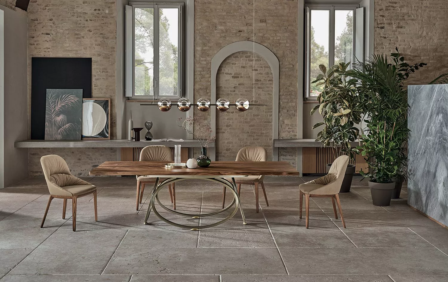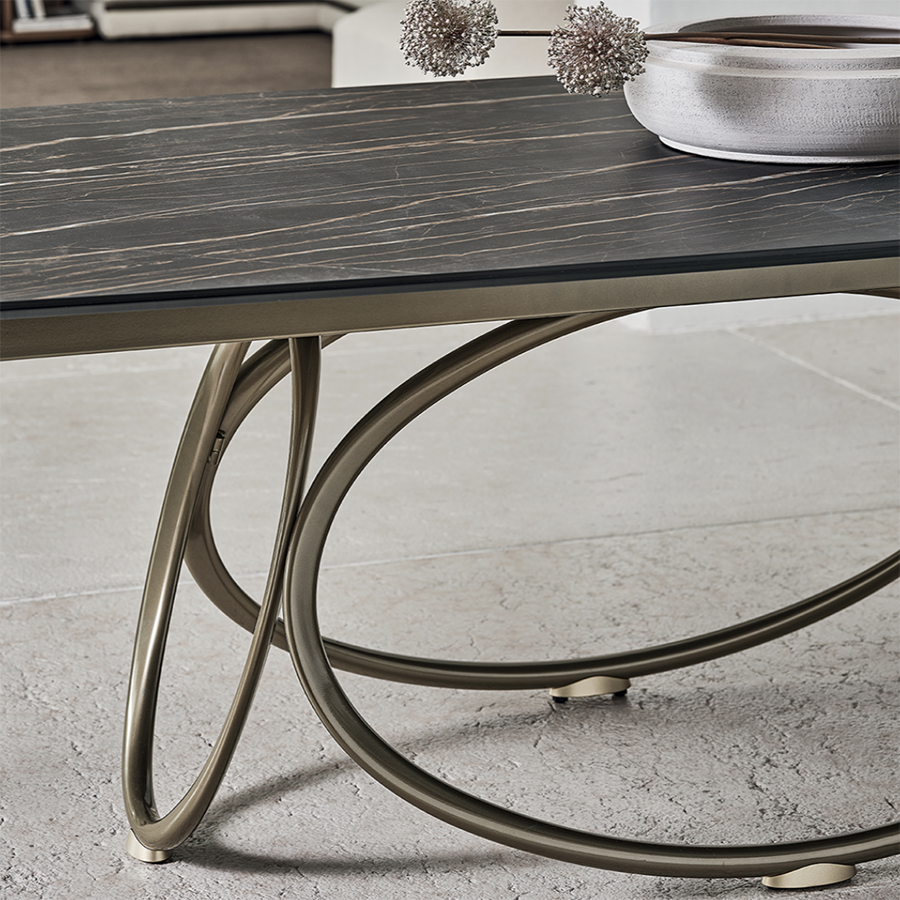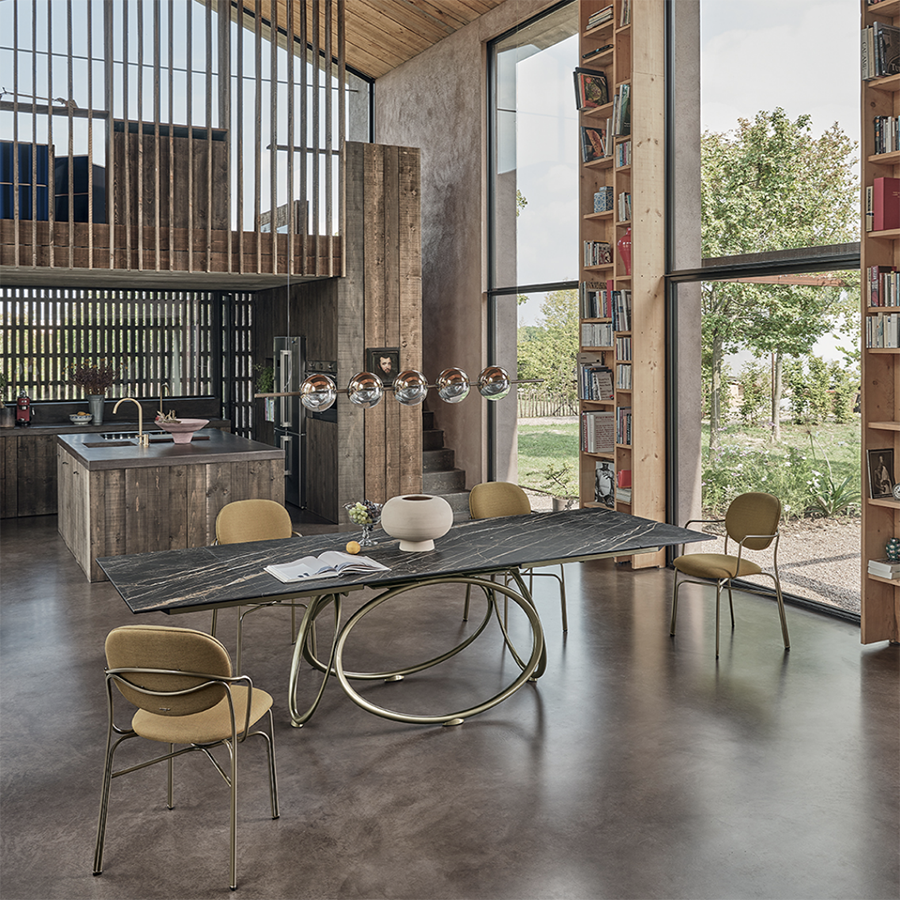 Das Gestell zeichnet sich durch konzentrische geometrische Linien aus, die seine markante Persönlichkeit unterstreichen. Gefertigt aus lackiertem Stahl, ist es in verschiedenen Ausführungen erhältlich – von Antikmessing bis Gold – und bietet so unterschiedliche Looks. Je nachdem, ob Sie sich für eine Tischplatte aus Holz, Glas, SuperMarble oder SuperCeramic entscheiden, fügt es sich harmonisch in jedes Ambiente ein: Die vielfältigen Gestaltungsmöglichkeiten beweisen seine bemerkenswerte Vielseitigkeit.