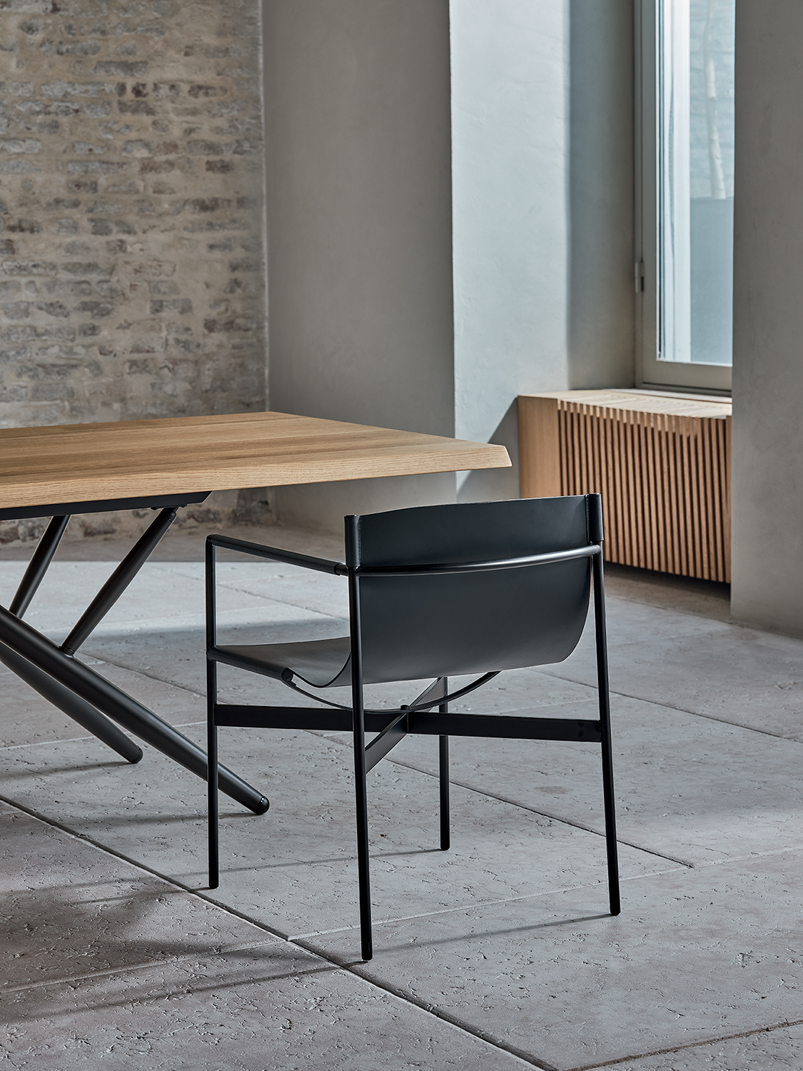 Stuhl mit oder ohne Armlehnen, Struktur aus lackiertem Stahl, gepolsterter Sitz mit nahtlosem Vollnarbenlederbezug. Weiche Linien ziehen sich durch den Stuhl und unterstreichen die gesamte Persönlichkeit. Dieser Stuhl ist mit oder ohne Armlehnen erhältlich und kann in einer Vielzahl von Ausführungen getragen werden, die ihn zu einem Objekt mit maximalem Ausdruck machen.
