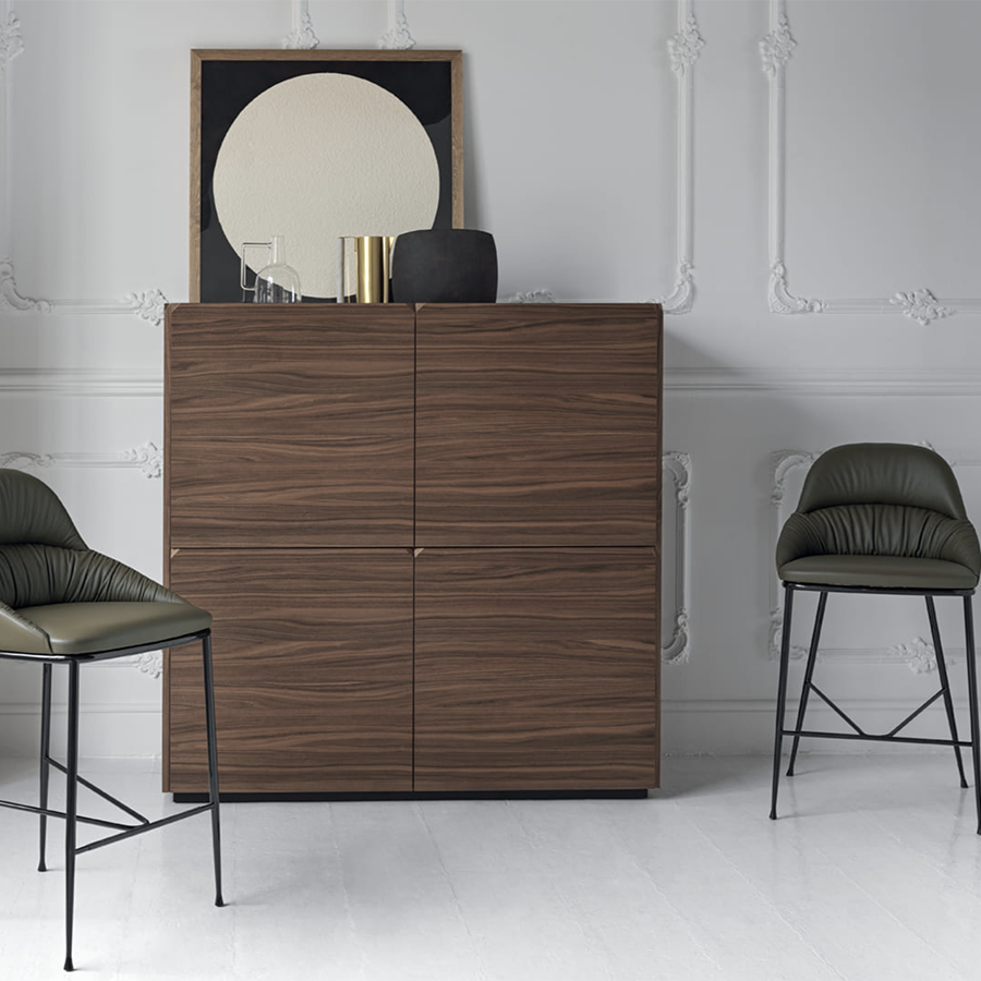Sideboard-Gruppe mit Holzstruktur, bestehend aus Flügeltüren und offenen Fächern, Seiten und Türen aus furniertem Holz. Oberteil Ihrer Wahl. Mit Sockel oder Gestell mit lackierten Stahlfüßen.