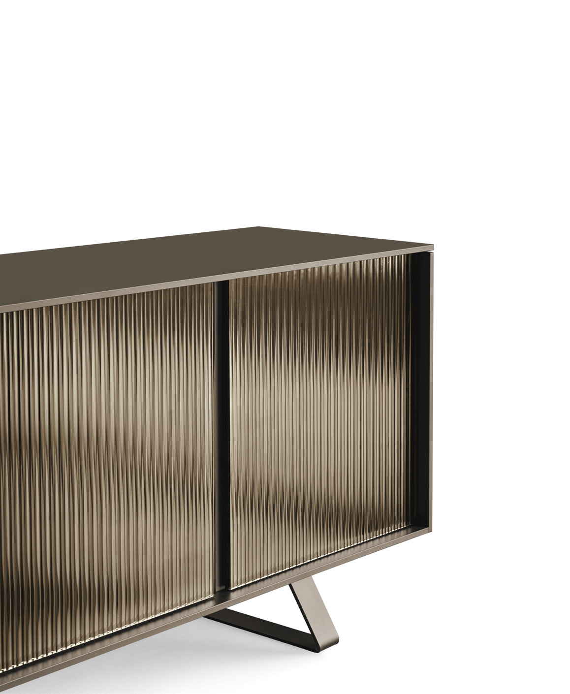 Eine neue Version mit verspiegelten Glastüren ist der Schlüssel zur Belebung eines Wohnzimmers und macht es dank großzügiger Volumen und geringer Dicke wertvoll und elegant.