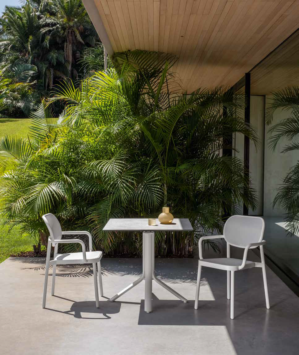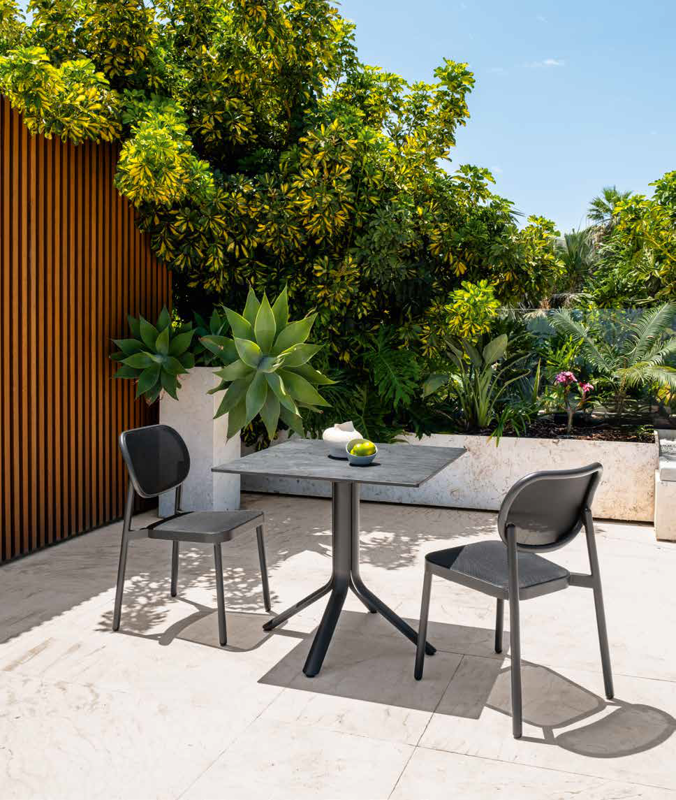 Die integrierten Armlehnen erhöhen den Komfort, während das ausgewogene und elegante Design es zur perfekten Ergänzung von Esstischen auf Terrassen und in Gärten mit modernem Stil macht.