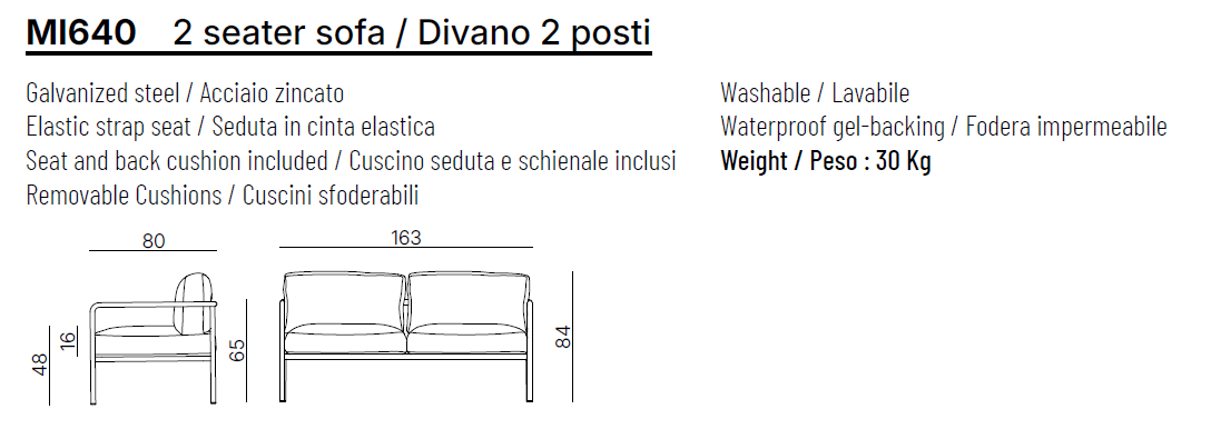 • cm: L. 163 x T. 80 x H. 84 x HS. 48 x HB. 65