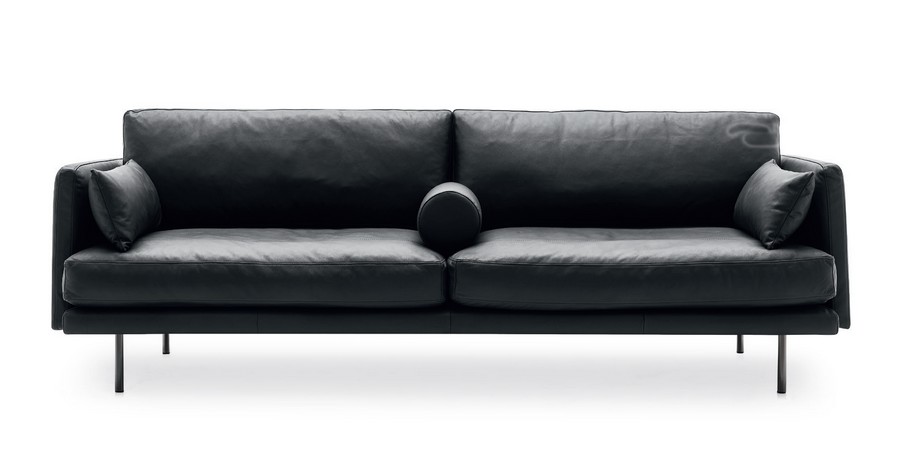 Modulares Sofa mit mehreren Variationen mit Metallfüßen. Das zeitgenössische und bequeme Mies-Sofa zeichnet sich durch tiefe und einladende Sitze aus, auf denen Sie sich völlig entspannen können. Das Hauptmerkmal dieses Sofas besteht darin, dass es die Möglichkeit bietet, sowohl die optionalen Kopfstützenrollen mit Metallschnalle als auch die Lendenstützen mit jedem Stoff der Kollektion individuell zu gestalten.