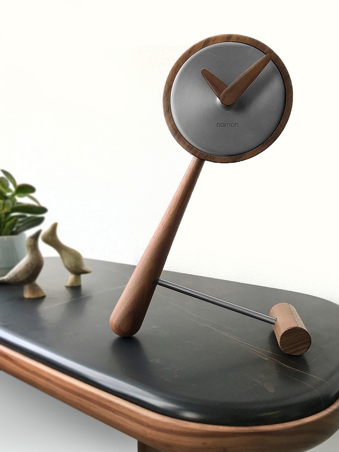Die Mini Puntero Clock von Nomon ist eine minimale Tischuhr aus prächtigem Walnussholz. Der Innenraum besteht aus Graphit oder goldenem Metall. Mini Puntero verbessert Ihre Umgebung, indem es Sie dank des deutschen UTS-Mechanismus, der bei dieser einzigartigen Uhr keine Sekunde verliert, immer an die Zeit erinnert.