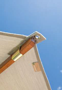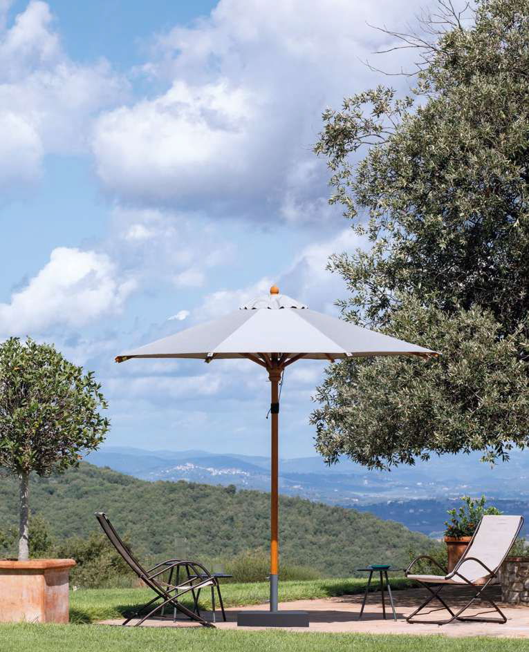 Das Gestell besteht aus laminiertem Tulpenholz, einem Material, das aufgrund seiner Langlebigkeit und natürlichen Optik gewählt wurde und sich harmonisch in jede Außenanlage einfügt. Die Tulpenholzstreben mit Schnellverschluss ermöglichen eine einfache Handhabung des Sonnenschirms.