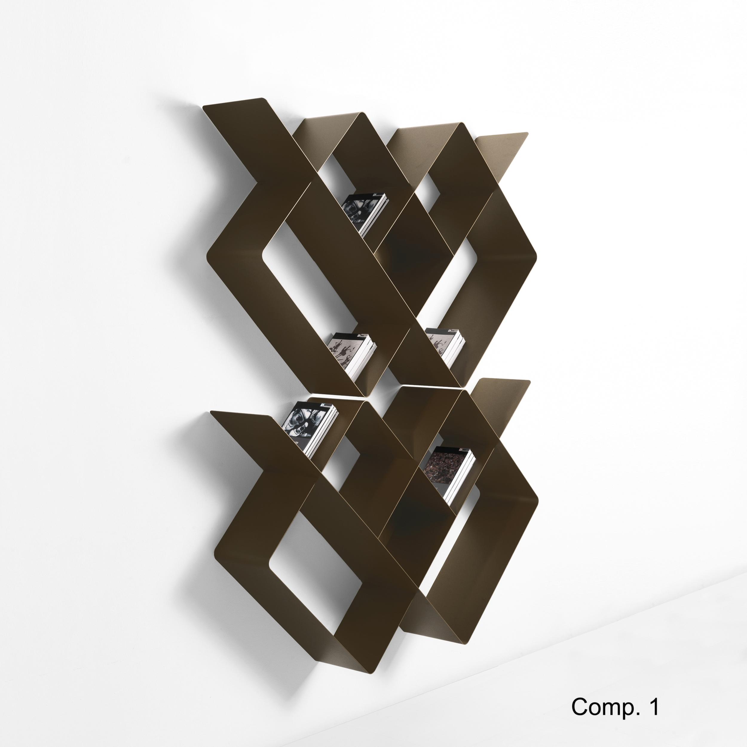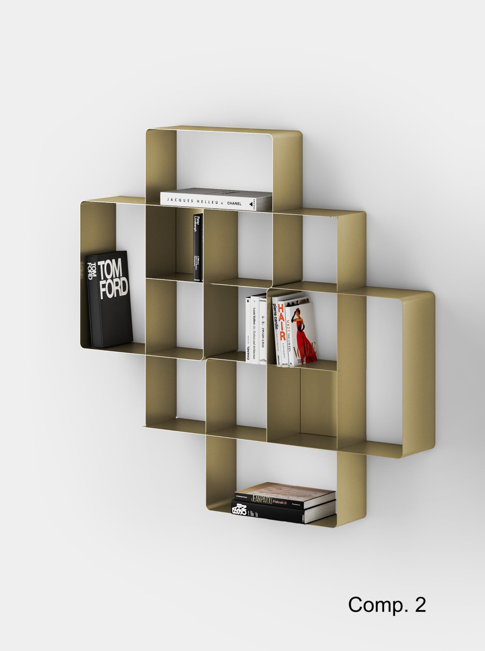 Modulares Bücherregal aus lackiertem Stahl. Die Basiseinheit besteht aus zwei ineinandergreifenden Spiegelelementen mit unterschiedlichen Tiefen (22 cm und 25 cm) sowie einer farbigen Rückwand in der Mitte.