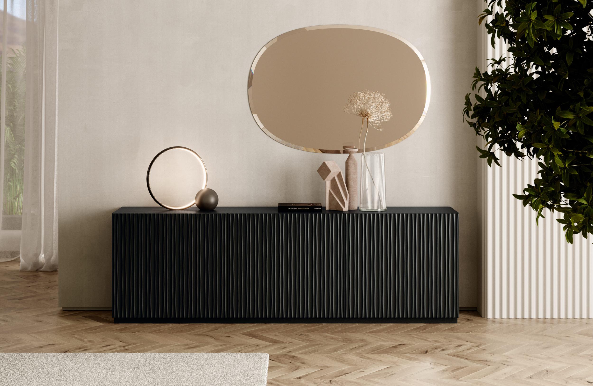 Das Musa-Sideboard ist ein Vorschlag für den Wohnbereich, der sich durch die weichen und harmonischen Linien auszeichnet, aus denen es besteht. Kann mit lackierten Stahlfüßen vom Boden angehoben oder auf den Boden gestellt werden. Struktur und Sockel aus Holz in verschiedenen Ausführungen erhältlich, Einlegeböden aus transparentem Glas.