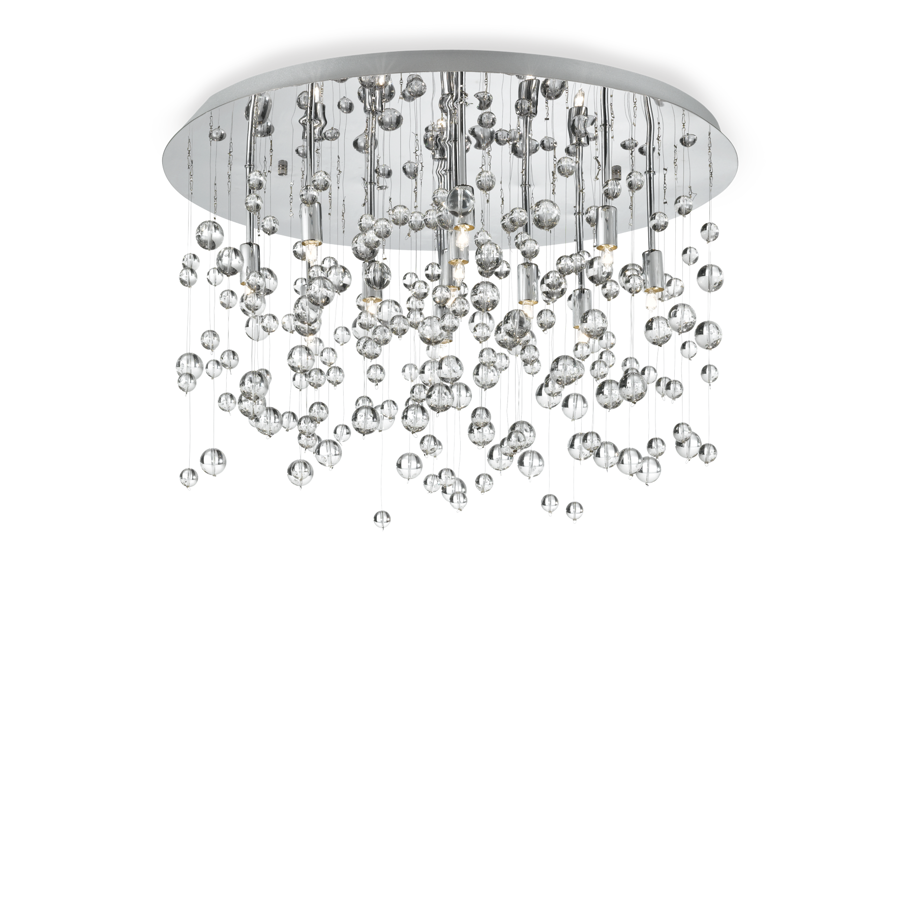 NEVE PL8 verchromter Deckenleuchter von Ideal Lux mit Metallrahmen. Dekoelemente mit an Nylonfäden befestigten Glaskugeln. Erhältlich mit Chromrahmen und transparenten Kugeln. LED-Leuchtmittel im Lieferumfang enthalten.