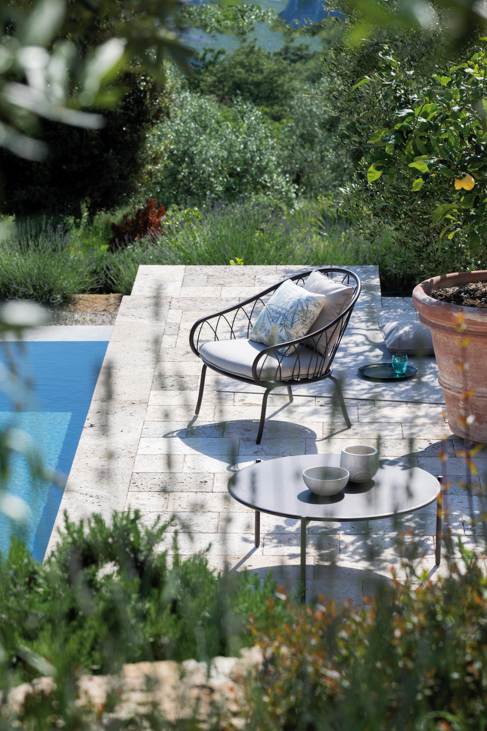 Die Flora-Linie von Vermobil präsentiert diesen niedrigen Sessel, der mit den übrigen Komponenten kombiniert werden kann, um eine elegante und praktische Outdoor-Lounge zu bilden. Erhältlich mit Eisenrahmen in verschiedenen Farben und zwei Stoffkissen an Rücken und Sitz in verschiedenen Ausführungen. Dieser Sessel ist aus widerstandsfähigen Materialien gefertigt und sorgt auch außerhalb des Hauses für Eleganz.