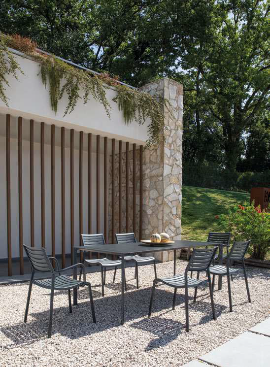 Der Stuhl Nina von Vermobil. Ein schlichtes Design, das mit einer eleganten und zeitlosen Silhouette die Persönlichkeit des Stuhls unterstreicht. Stuhl aus verzinktem Stahl mit Sitzfläche und Rückenlehne aus Polypropylen.