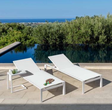 Die Outdoor-Sonnenliege aus der Nunù-Kollektion von talenti verfügt über elastische Kunstharzgurte, eine Rückenlehne und Sitzfläche aus Textilene sowie einen lackierten Aluminiumrahmen.