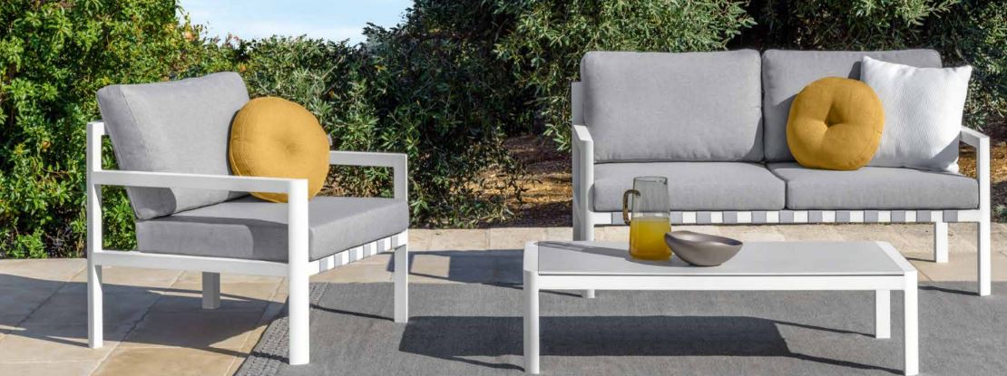 Der Wohnzimmersessel aus der Nunù-Kollektion von Talenti verfügt über synthetische elastische Gurte, die Sitzfläche und Rückenlehne stützen, einen lackierten Aluminiumrahmen und abnehmbare Stoffkissen mit schnelltrocknender Schaumstoffpolsterung.