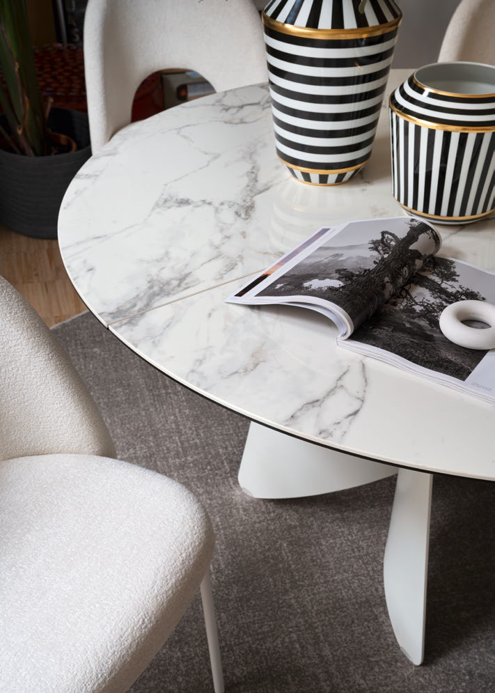 Dank seiner Vielseitigkeit passt sich der Orion-Tisch perfekt jedem Stil an. Die Tischplatten aus Keramik und Melamin verleihen ihm einen Hauch von Raffinesse und Individualität und ermöglichen so die Schaffung eines einzigartigen und makellosen Ambientes.