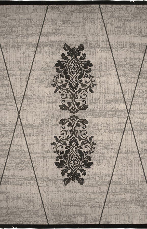 Der Teppich Palmanova von Tonin Casa ist ein Teppich mit einer eleganten und modernen Linie, der in der Mitte eine Blumendekoration aus Damaskus-Industriegarn zeigt. Mit Fransen ist dieser Teppich in schwarz und gold melange oder silber und gold melange erhältlich.